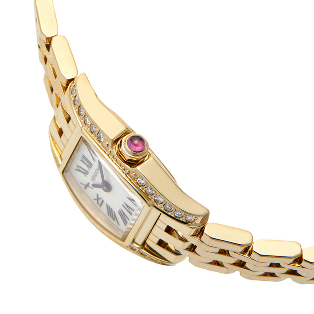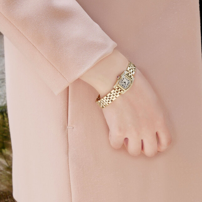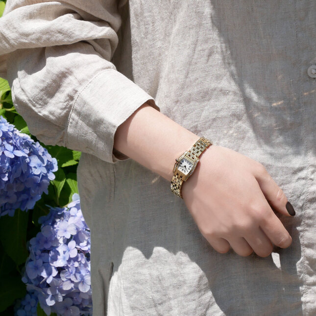 カーブを持たせたフェイスが優しい印象の、シーンを選ばずコーディネートしやすい上品な腕時計。