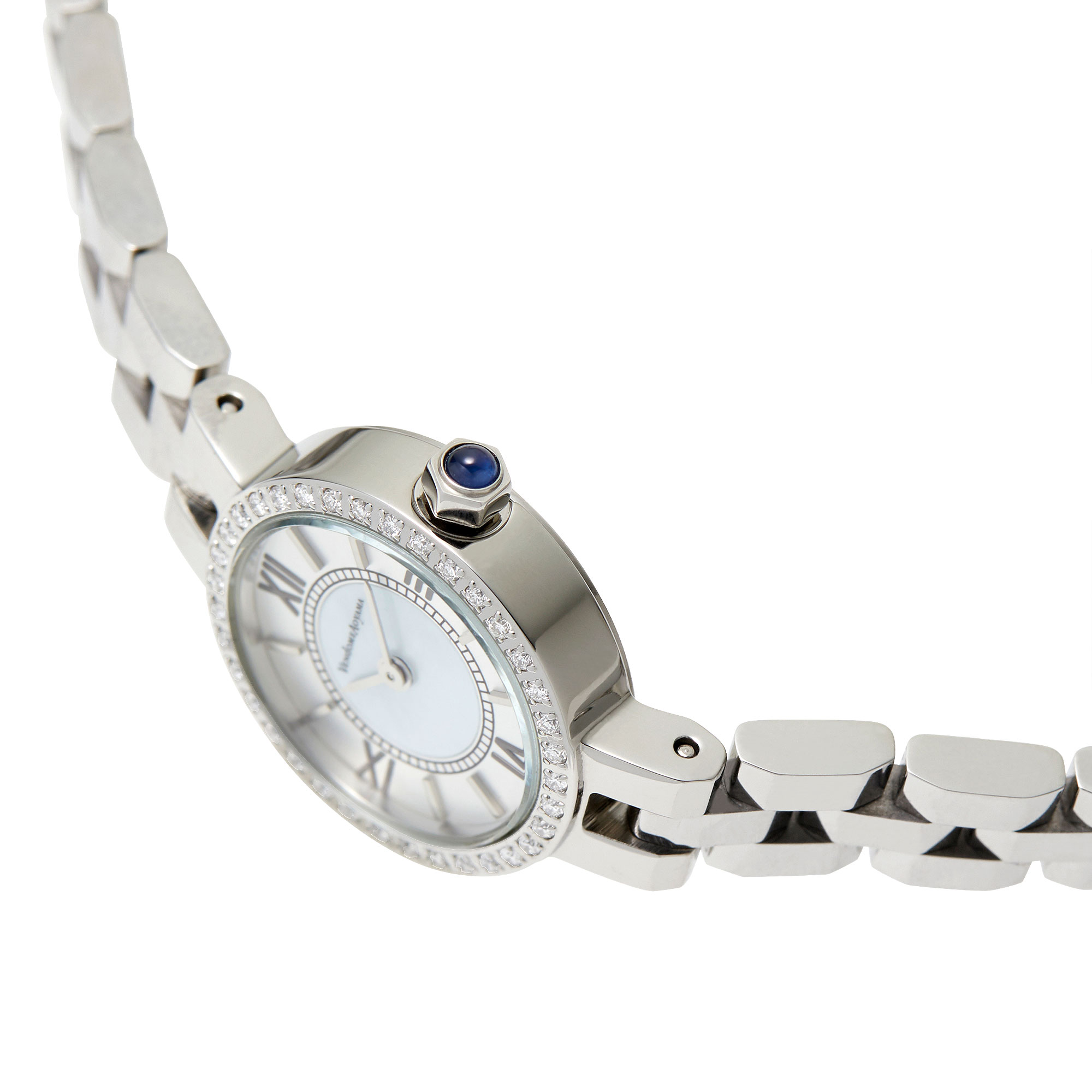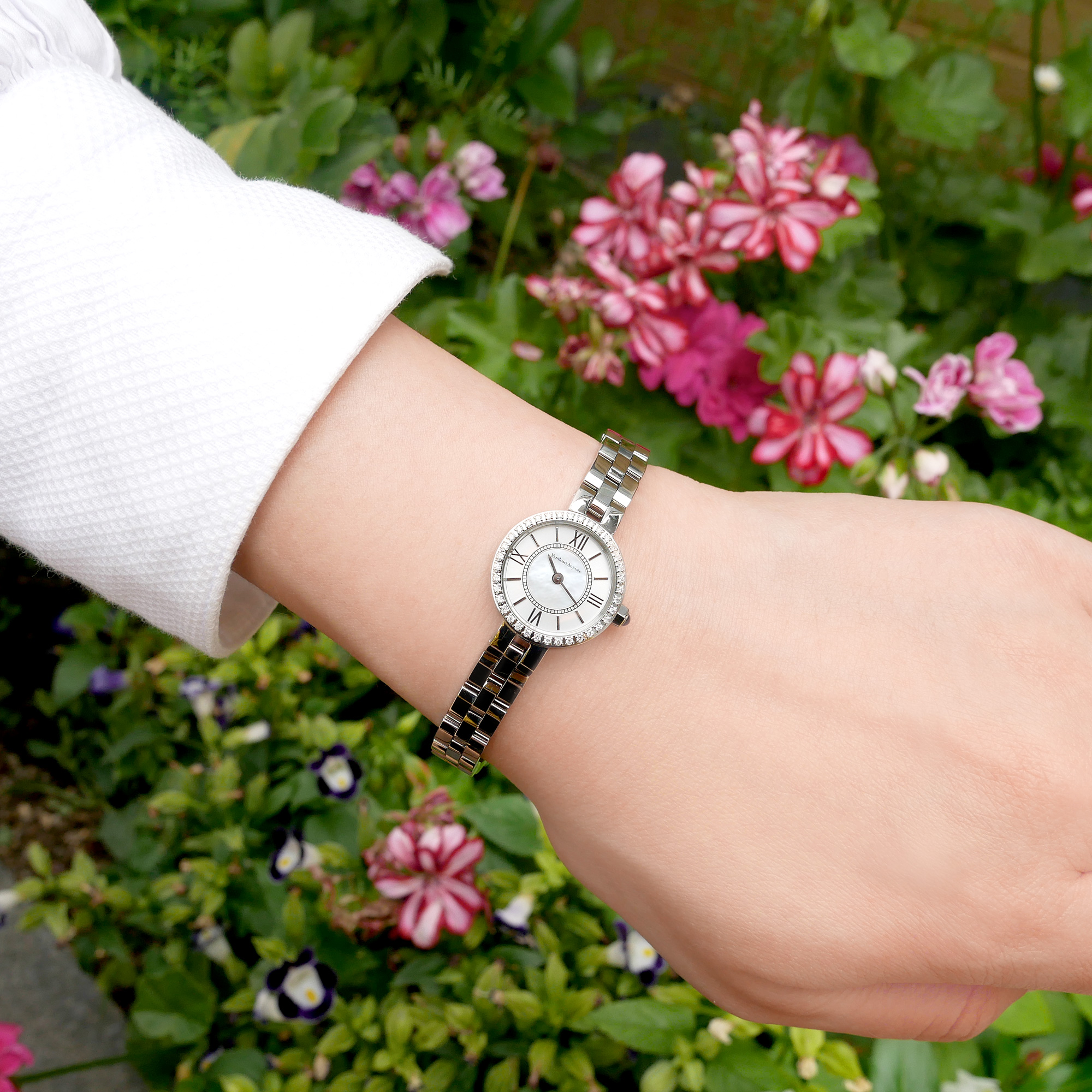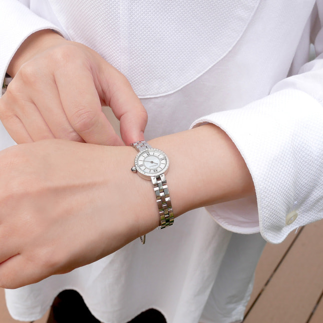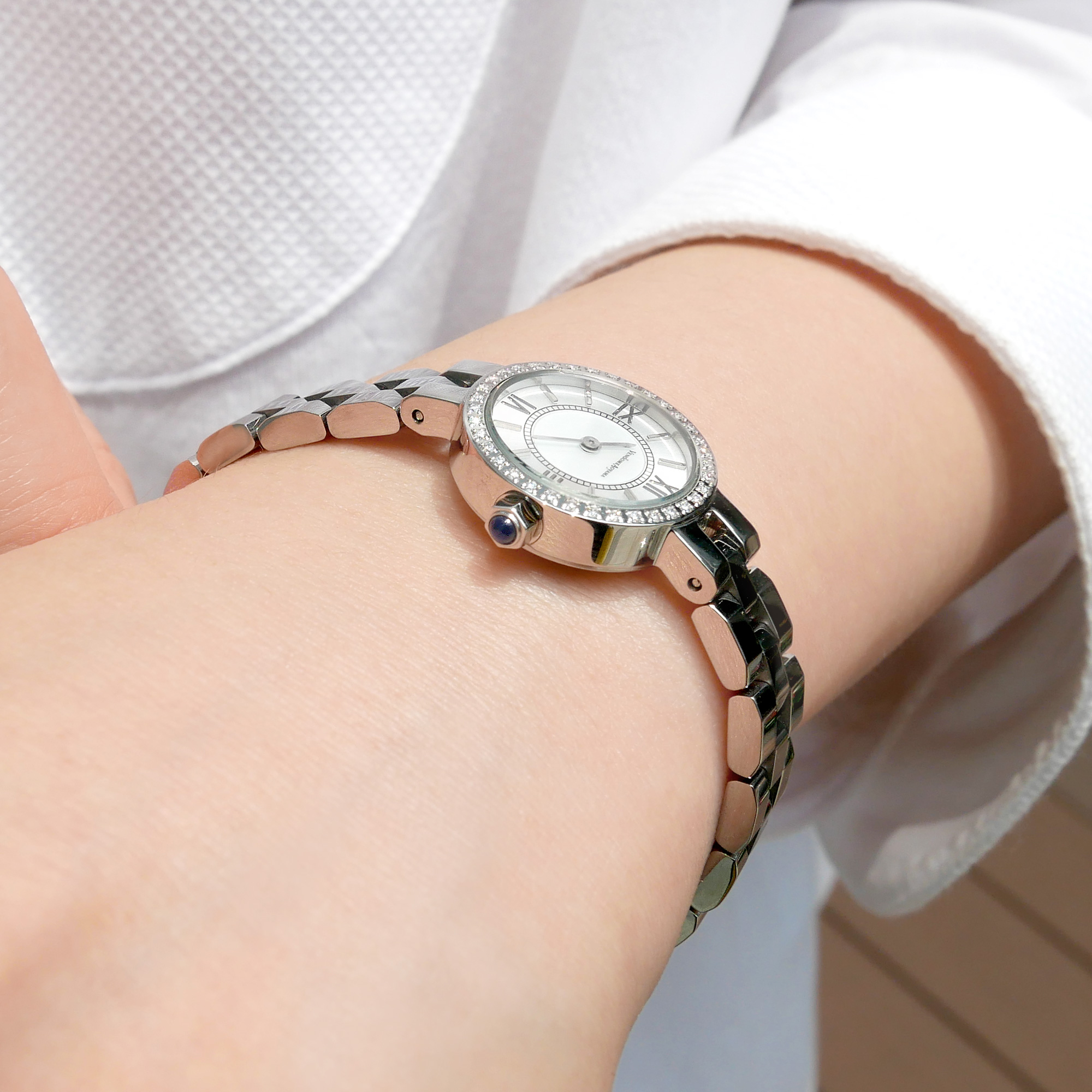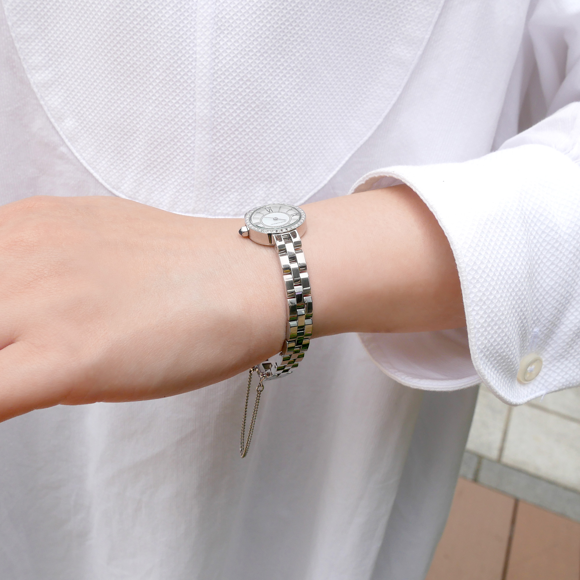 ベゼルに一周セッティングされたダイヤモンドが、女性らしいラグジュアリーさをプラスします。