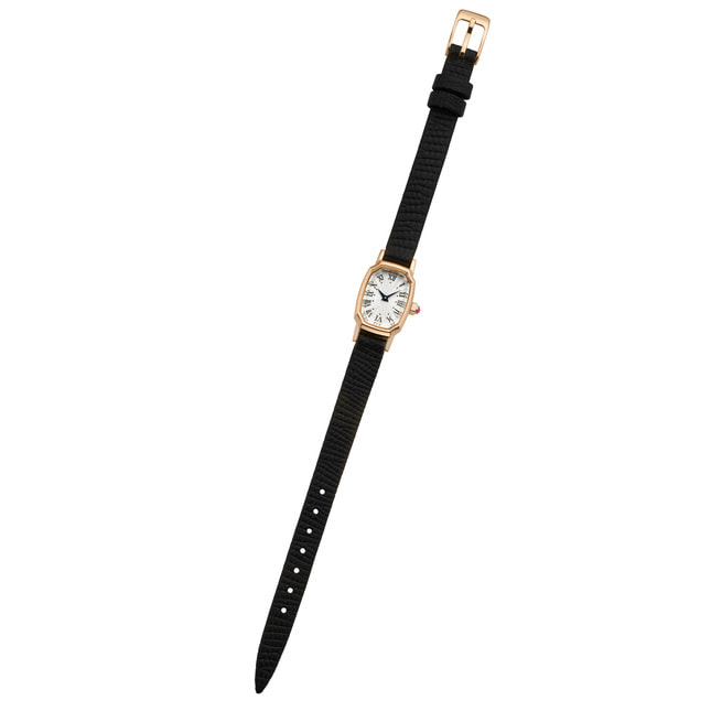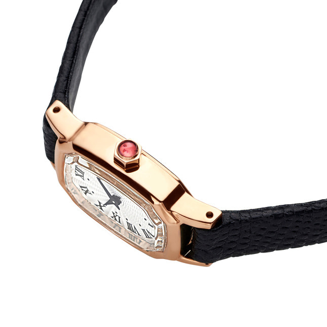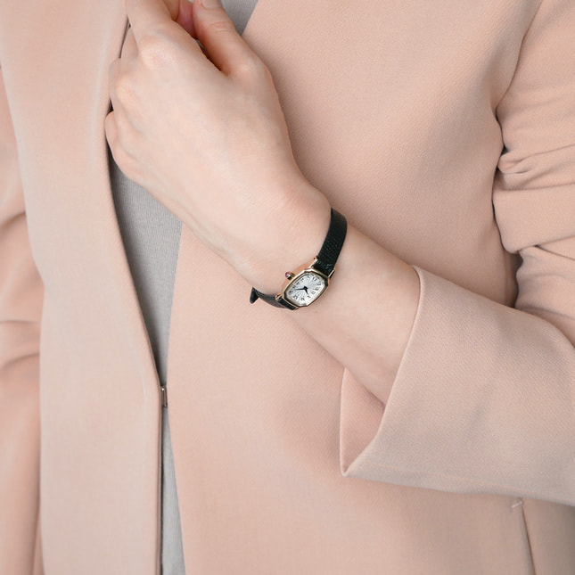 ピンクゴールドメッキは、ごく淡いロゼワインのよう。ほのかなピンクと黒革ベルトの組み合わせが大人っぽい印象に。