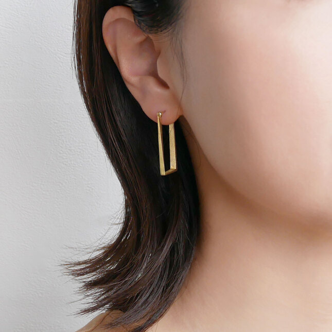日本を代表する建築家 隈研吾氏と、デザイナー 大村真有美氏のデザインユニット。新感覚で身近なアート、ライフスタイルの実現に取り組む彼らとヴァンドーム青山のコレクションラインです。 隈研吾建築のディテールから抜き取った シンプルな形(shape)をジュエリーにアレンジしたピアス。 隈研吾建築に多く見られる長方形モチーフは見る角度によって異なるマット/シャインの質感やラインの形状が楽しめるデザイン。 建材のようなニュアンスある輝きが横顔に個性的なおしゃれ感をプラスしてくれます。 シンプルなオブジェクトの美しさを楽しめるモダンなデザインは、ベーシックなコーディネートのアクセントにおすすめです。 ▼シリーズアイテムはこちらピアス(縦:約27.0mm、横:約2.5mm/K18イエローゴールド)Kengo Kuma + MA, YU アイテム一覧
