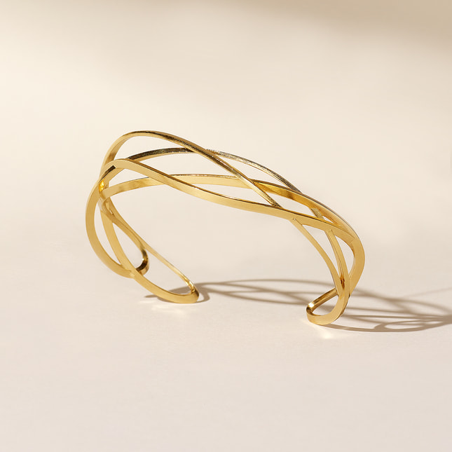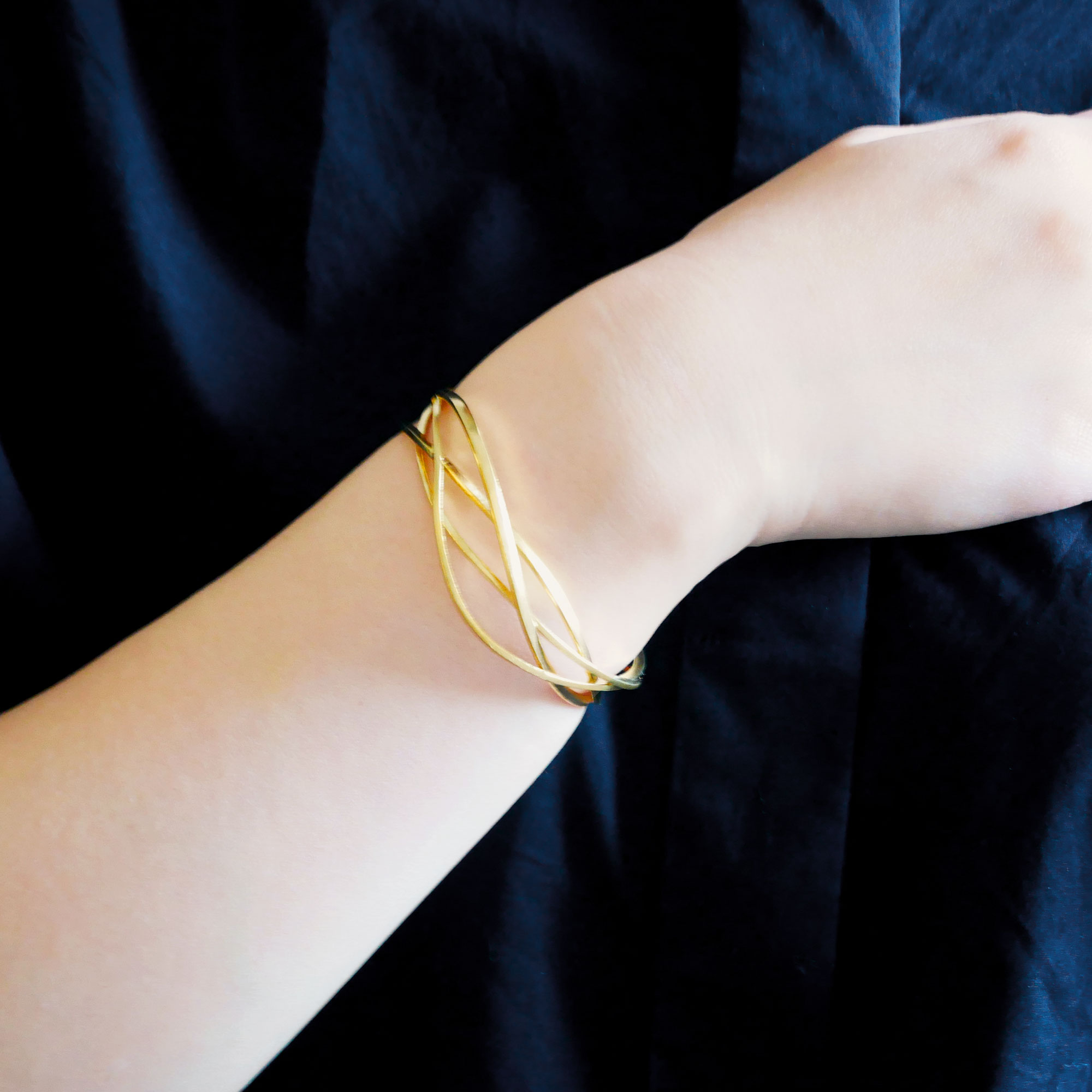 日本を代表する建築家 隈研吾氏と、デザイナー 大村真有美氏のデザインユニット。 新感覚で身近なアート、ライフスタイルの実現に取り組む彼らとヴァンドーム青山のコレクションラインです。 京都・平安神宮に作られたパビリオン「GURU-GURU」(ぐるぐる)がデザインソース。吉野杉の曲木によるパビリオンをシルバーで表現したシリーズです。ひとつながりのラインをぐるぐると巻いたような立体感の中に、木材のハリやたわみを感じさせる大胆なデザイン。地金の表面はあえてピカピカに磨き上げないことで、木の持つ柔らかなテクスチャを表現しました。 手首に巻きつくような立体感が特徴のバングル。 存在感を出しつつ柔らかさのあるデザインは、コーディネートのアクセントに。 滑らかな光沢のイエローゴールドが手元に華やかさを演出します。 ▼シリーズアイテムはこちらGURU-GURU シリーズKengo Kuma + MA, YU アイテム一覧