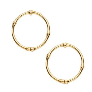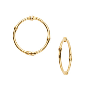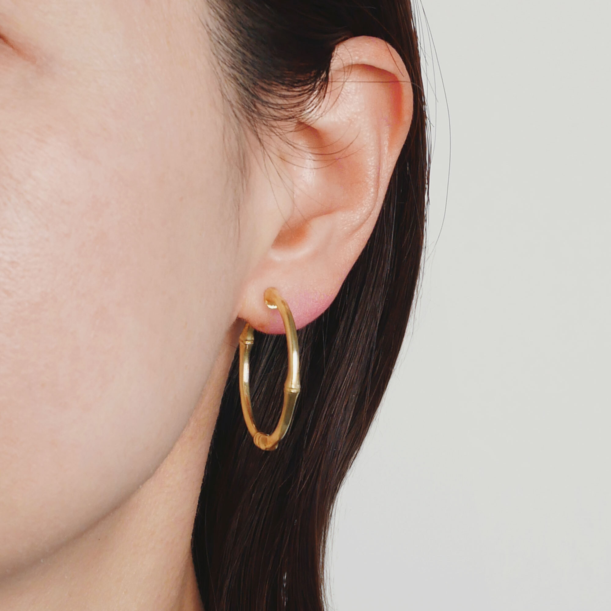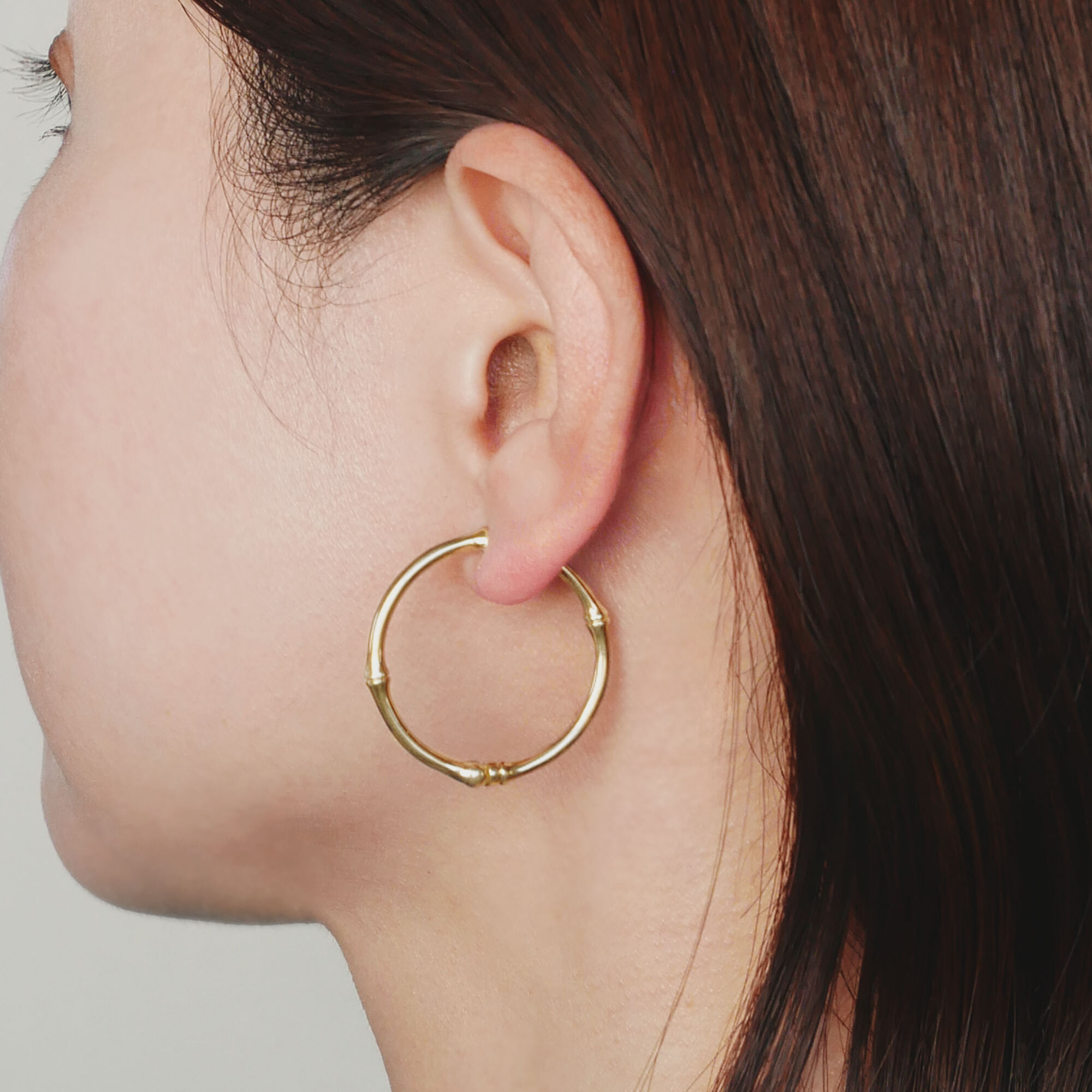 日本を代表する建築家 隈研吾氏と、デザイナー 大村真有美氏のデザインユニット。新感覚で身近なアート、ライフスタイルの実現に取り組む彼らとヴァンドーム青山のコレクションラインです。 竹そのもののシンプルな美しさを建築にした隈研吾氏の代表作「竹の家」がデザインソースの「bamboo」シリーズから、ピアスのようなイヤリング、大人気のピアリングです。 何にでもあわせやすい大ぶりのフープピアリングは、艶やかな地金が存在感を放ち、bambooの節がシンプルなフープのポイントになっているデザインです。 ピアスの方がホール以外の場所につけるのもおすすめ。 耳周りのおしゃれのバリエーションが広がるアイテムです。 ピアリングは特許取得の金具を使用しており、挟むだけでしっかりとホールドされ落ちにくい構造です。 またバネとは違うので耳たぶに力がかからず、1日中着けていても痛くなりにくい特徴があります。 ▼シリーズアイテムはこちらBamboo シリーズKengo Kuma + MA, YU アイテム一覧