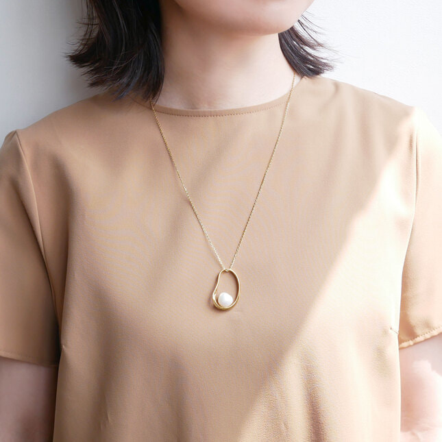 日本を代表する建築家 隈研吾氏と、デザイナー 大村真有美氏のデザインユニット。新感覚で身近なアート、ライフスタイルの実現に取り組む彼らとヴァンドーム青山のコレクションラインです。 ユニークな移動式茶室『TEEHAUS』(ティーハウス)をモチーフにしたネックレス。 ピーナッツを思わせる、有機的なフォルムが柔らかさと、どこかほっとするような安らぎを感じさせるデザイン。 輪郭の美しさを地金のラインで、ふんわりとした丸みをパールで表現しました。 天然のバロックパールを使用することでより優しく、オーガニックな雰囲気に仕上げています。 ▼カラーバリエーションはこちらシルバー ▼シリーズアイテムはこちらTEEHAUS シリーズ▼6月誕生石 パール・真珠のアイテムはこちらKengo Kuma + MA, YU アイテム一覧