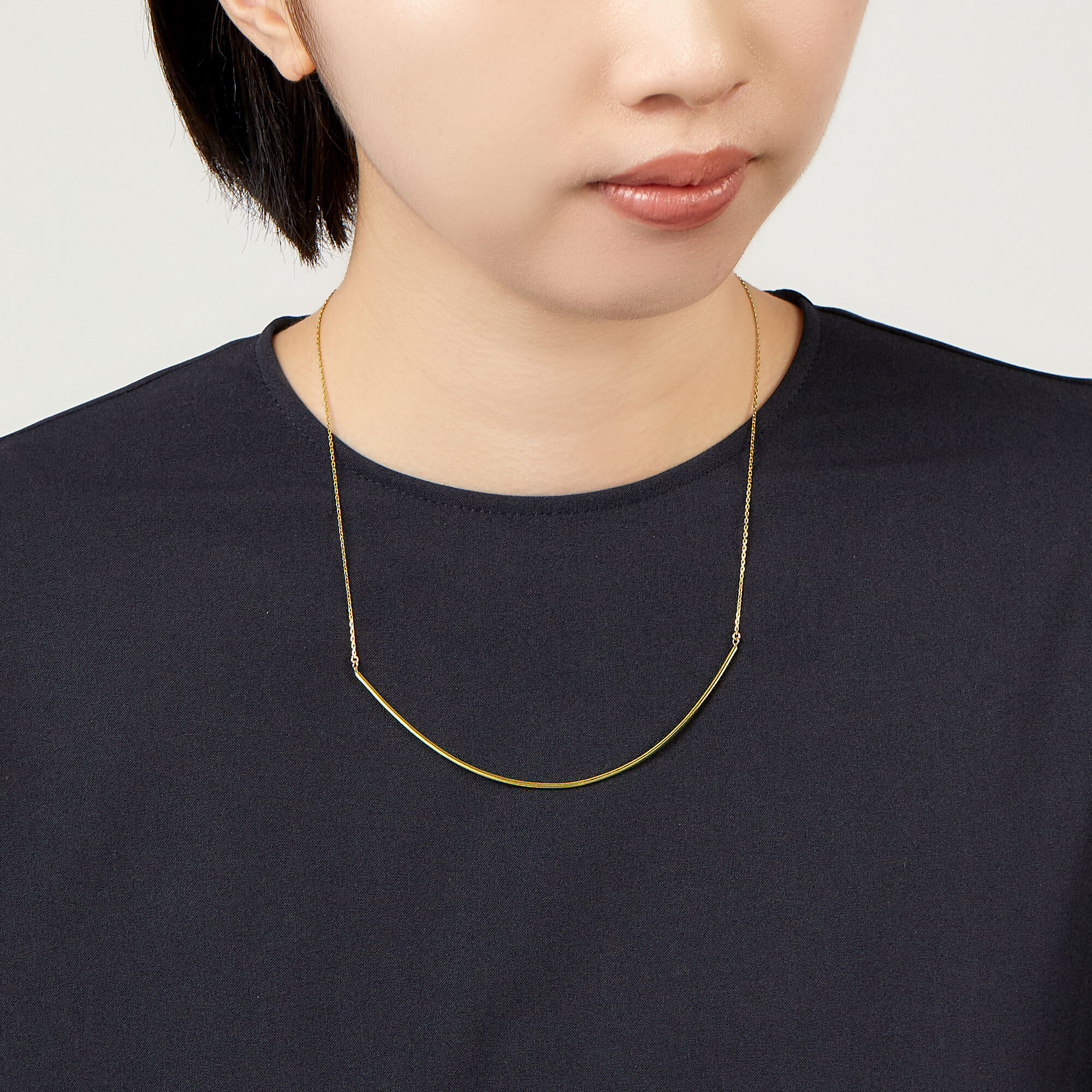 日本を代表する建築家 隈研吾氏と、デザイナー 大村真有美氏のデザインユニット。新感覚で身近なアート、ライフスタイルの実現に取り組む彼らとヴァンドーム青山のコレクションラインです。 隈研吾氏がスパゲティから空間の発想を得た「Pasta」シリーズ。 地金のラインだけで描いたシンプルなネックレス。 ゆったりとしたカーブのラインと地金のハーフマットな質感がモダンなおしゃれ感を演出してくれます。 素肌の上ではさりげなく輝き、濃い色の服と重ねると存在が引き立って印象が変わります。 ▼カラーバリエーションはこちらシルバー ▼シリーズアイテムはこちらPasta シリーズKengo Kuma + MA, YU アイテム一覧