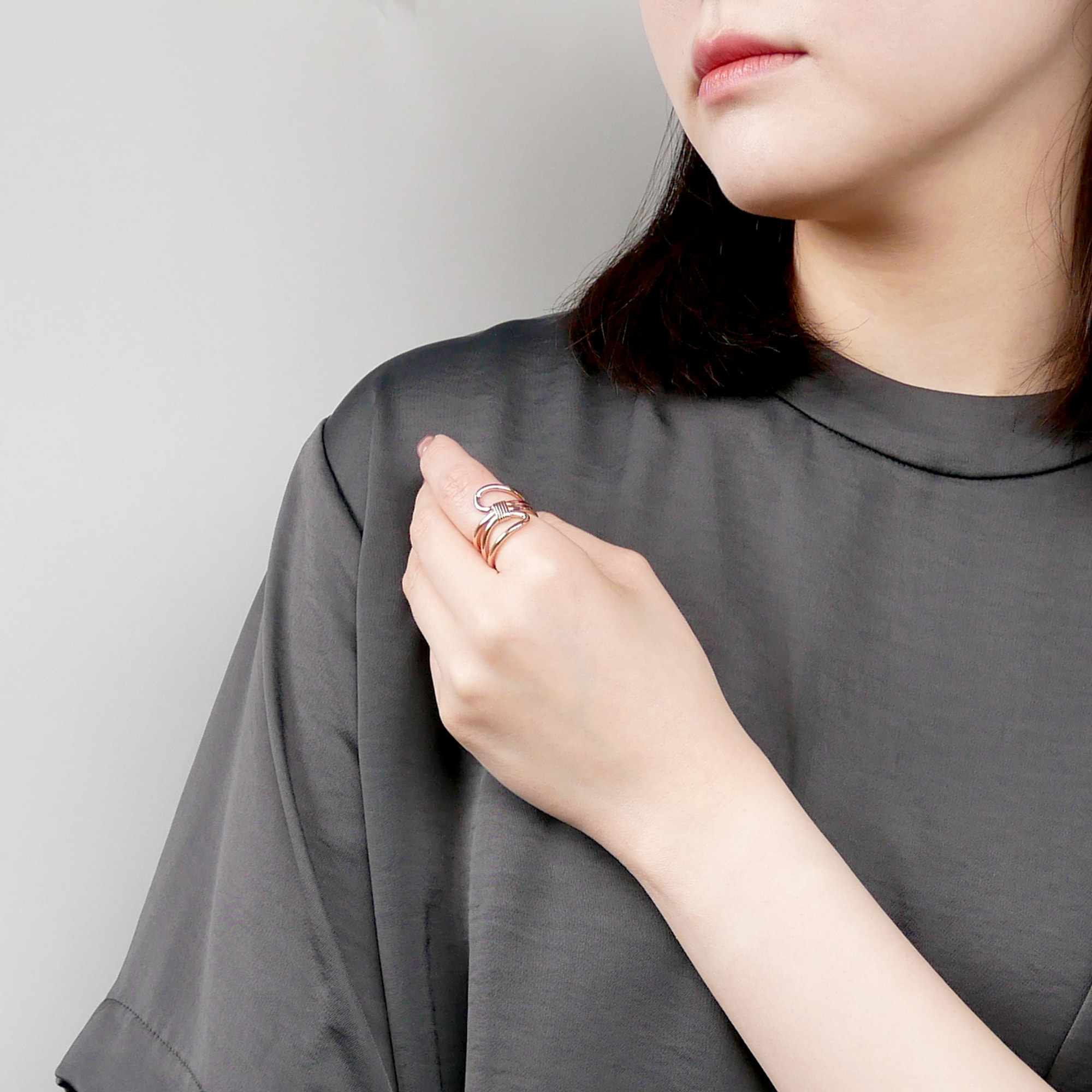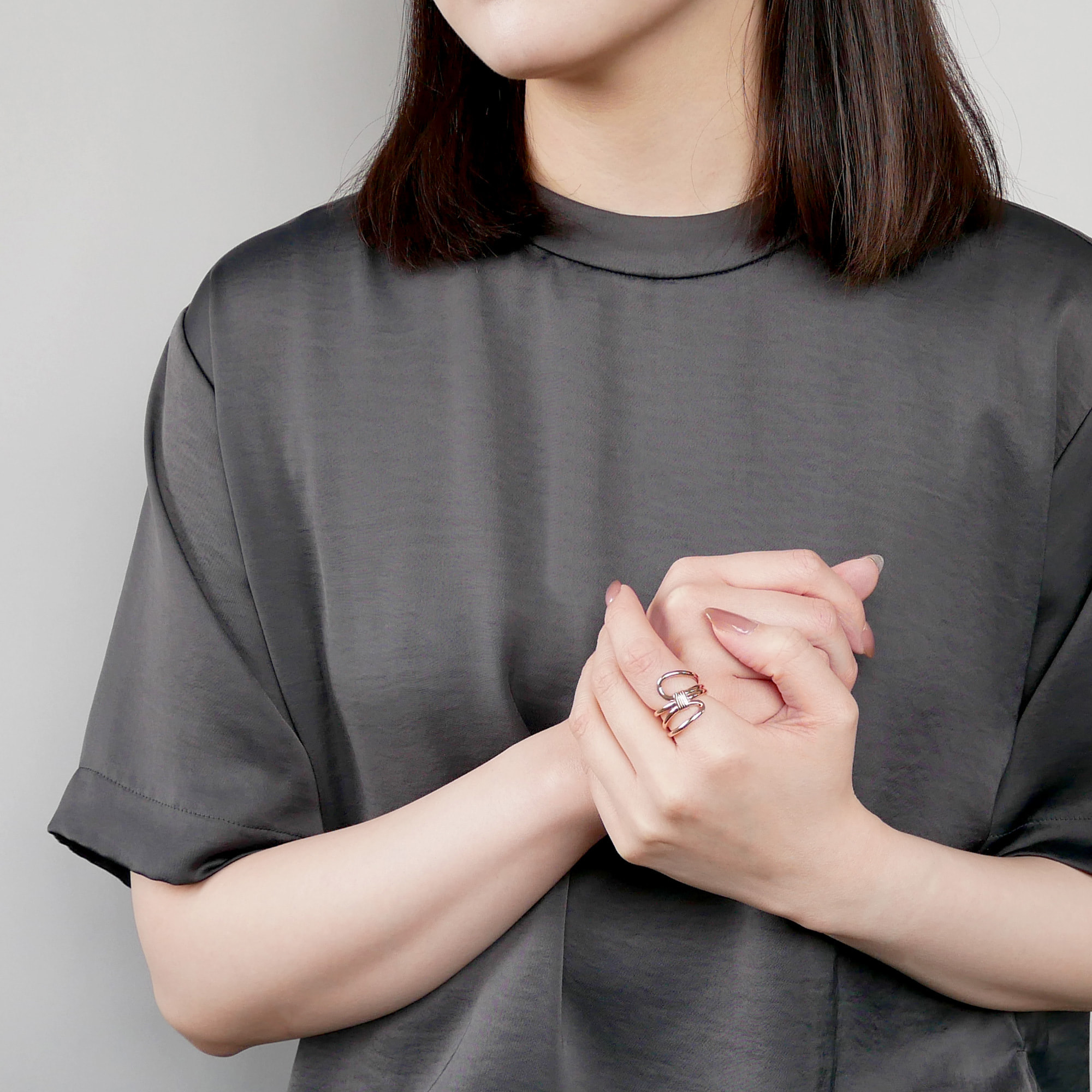 日本を代表する建築家 隈研吾氏と、デザイナー 大村真有美氏のデザインユニット。新感覚で身近なアート、ライフスタイルの実現に取り組む彼らとヴァンドーム青山のコレクションラインです。 軽さや曲げ加工の容易さが特徴の籐(ラタン)家具。 「ひとふでがき」のような1 本のラインでつくられた隈研吾氏のプロダクトをデザインソースにした、大胆な曲線フォルムのシルバージュエリーです。 存在感のある幅広リングは、細部まで立体感にこだわった作りに。 手元にモダンな表情を演出します。 ラタンの滑らかな素材感を感じさせるピンクゴールドメッキが新鮮です。 ▼シリーズアイテムはこちらRattan シリーズKengo Kuma + MA,YU アイテム一覧
