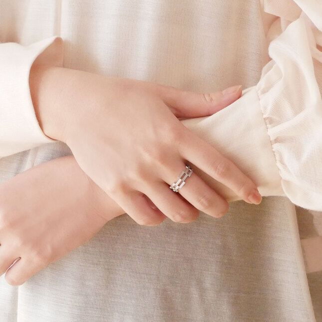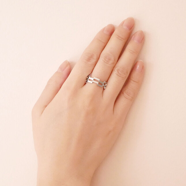 日本を代表する建築家 隈研吾氏と、デザイナー 大村真有美氏。彼らとヴァンドーム青山が創り出す、新感覚のジュエリーコレクションラインです。 規則的なパターンが印象的な隈研吾氏の建築「ロータス・ハウス」がデザインソースの「Lotus」シリーズ。 半分透けたリングは建築の意図を踏襲し、ボリュームがありながらも着ける人になじみ、調和します。 素材感のあるヘアラインのテクスチャーは光りすぎずアーティスティックな雰囲気。 ジェンダーレスなデザインは女性が着ければモダンで華やかに、男性が着ければクールでスタイリッシュに手元を演出します。 ペアでお使いいただくのはもちろん、Lotusシリーズの他アイテムとのコーディネートもおすすめです。 ▼カラーバリエーションはこちらイエローゴールド ▼シリーズアイテムはこちらLotus シリーズKengo Kuma + MA, YU アイテム一覧