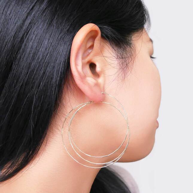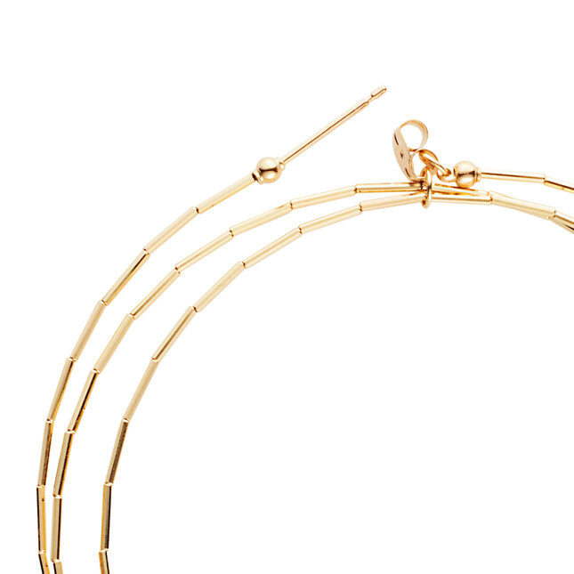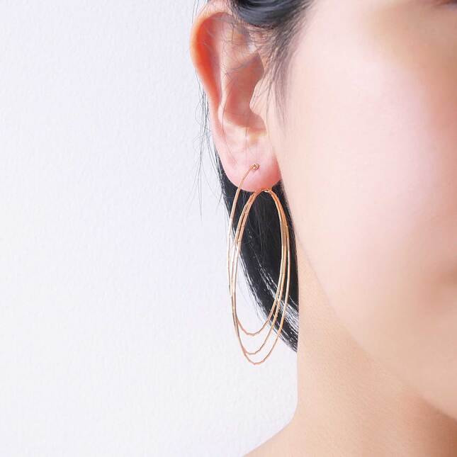 日本を代表する建築家 隈研吾氏と、デザイナー 大村真有美氏のデザインユニット。 新感覚で身近なアート、ライフスタイルの実現に取り組む彼らとヴァンドーム青山のコレクションラインです。 オーストラリア・シドニーのダウンタウンに立つコミニュティセンター[The Exchange]がデザインソース。 建築の大きな特徴である木製のスパイラルのファサードを、ジュエリーで表現しました。 まさに建築のイメージそのもののフープピアスは、形状記憶加工を施されたワイヤーに極細ゴールドのビーズを隙間なく通して仕上げています。 細くなめらかな輪が3連になったフープは、着けると自然にズレが生じ、お顔まわりにエアリーな立体感とキラキラとした輝きのリズムを生み出します。 形状記憶加工が、ハリのある綺麗な円形をキープすると同時に、変形も防ぎます。 フープの終わりに直接キャッチが付いているので、なくす心配がないのも嬉しいポイント。 軽やかで着けやすいピアスです。 ▼シリーズアイテムはこちらThe Exchange シリーズKengo Kuma + MA, YU アイテム一覧