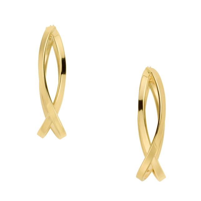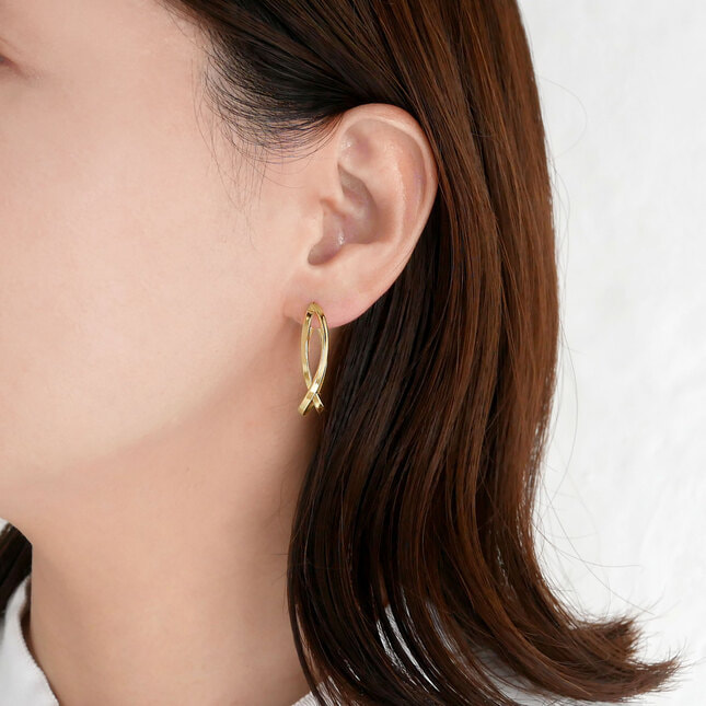 日本を代表する建築家 隈研吾氏と、デザイナー 大村真有美氏のデザインユニット。 新感覚で身近なアート、ライフスタイルの実現に取り組む彼らとヴァンドーム青山のコレクションラインです。 京都・平安神宮に作られたパビリオン「GURU-GURU」(ぐるぐる)がデザインソース。 ひとつながりのラインをぐるぐると巻いたような立体感が美しいフープピアス。 着け映えするサイズ感でありながら、軽やかで使いやすいデザイン。 ゴールドのツヤが顔まわりに華やかさをプラスします。 ▼シリーズアイテムは こちらKengo Kuma + MA, YU アイテム一覧