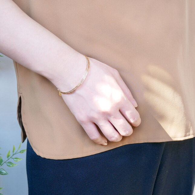 日本を代表する建築家 隈研吾氏と、デザイナー 大村真有美氏のデザインユニット。 新感覚で身近なアート、ライフスタイルの実現に取り組む彼らとヴァンドーム青山のコレクションラインです。 オーストラリア・シドニーのダウンタウンに立つコミニュティセンター「The Exchange」がデザインソース。 建築の大きな特徴である木製のスパイラルのファサードを、ジュエリーで表現しました。 まさに建築のイメージそのもののブレスレットは、形状記憶加工を施されたワイヤーに極細ゴールドのビーズを隙間なく通して仕上げています。 細くしなやかな輪が3連になったデザインは、着けると自然なズレが生じ、手元にキラキラとした輝きのリズムを生み出します。 輪を広げて腕を通すだけで、簡単に着脱できます。形状記憶加工がいつでも綺麗な円形をキープしてくれる、着けやすいブレスレットです。 ▼シリーズアイテムはこちらThe Exchange シリーズKengo Kuma + MA, YU アイテム一覧