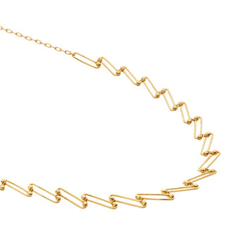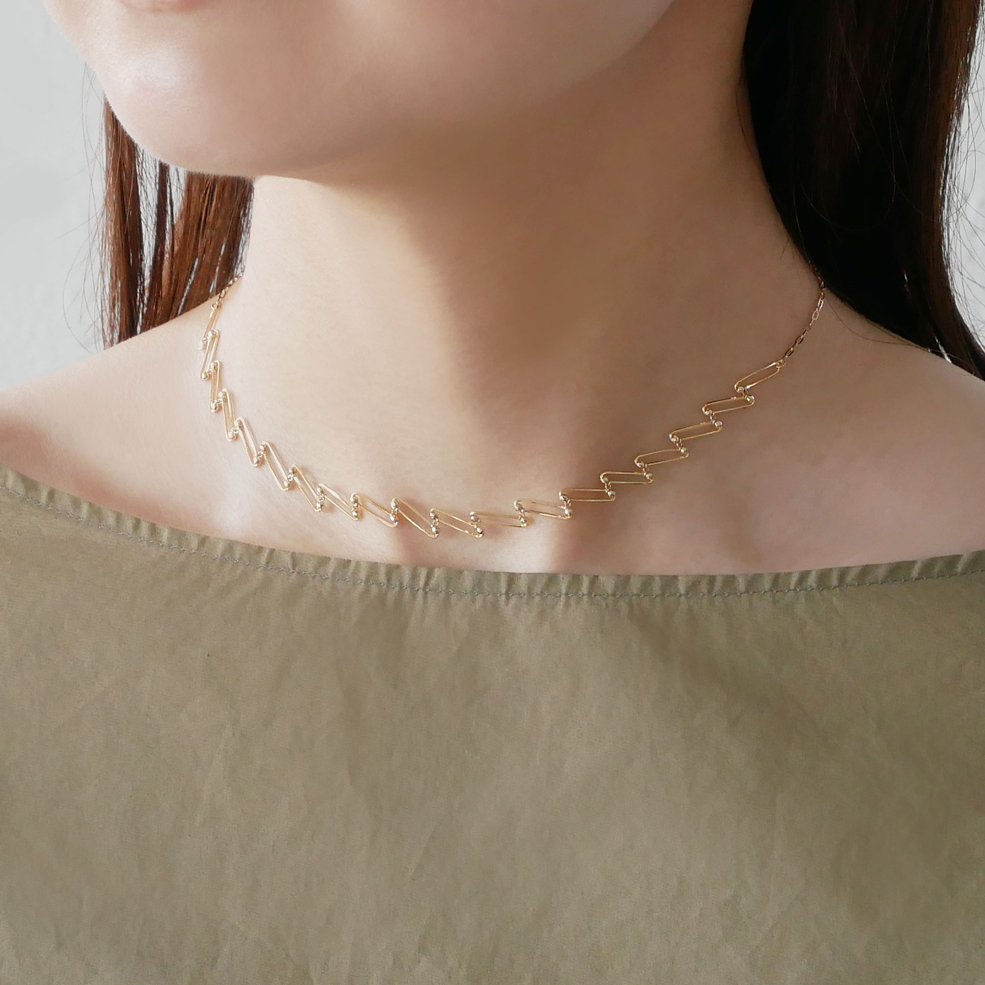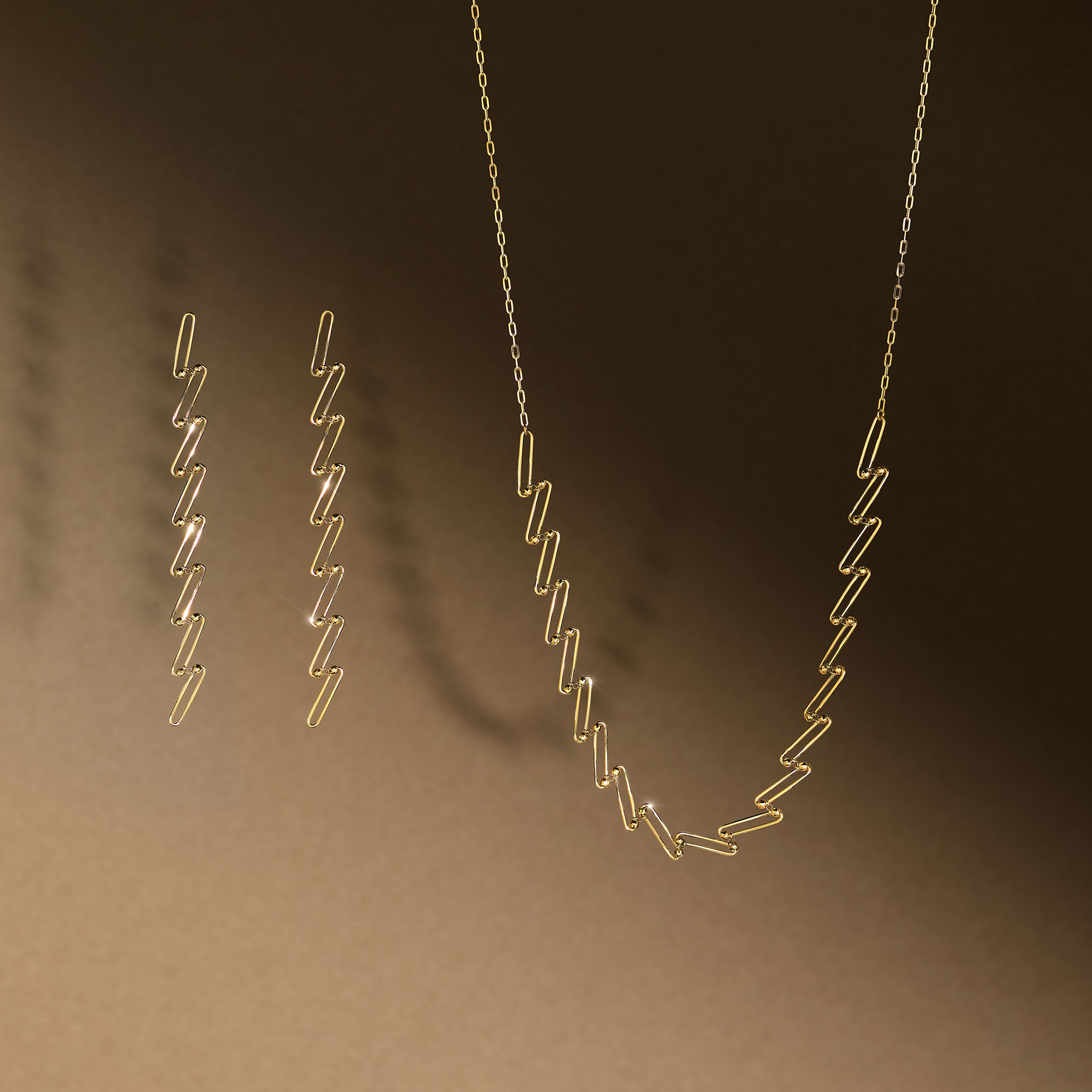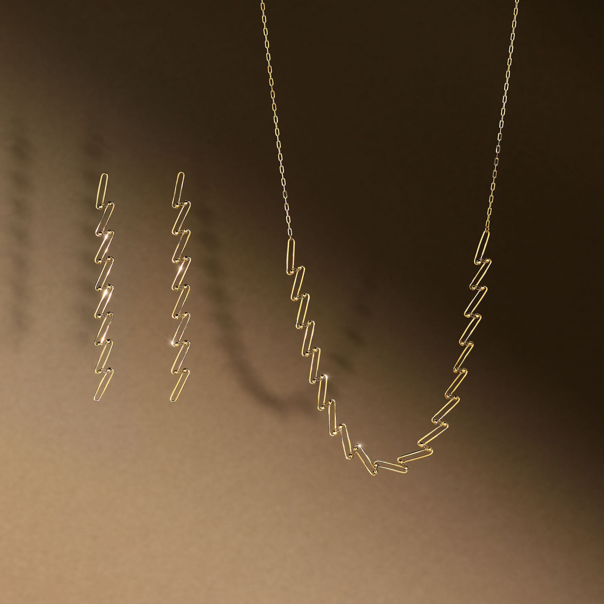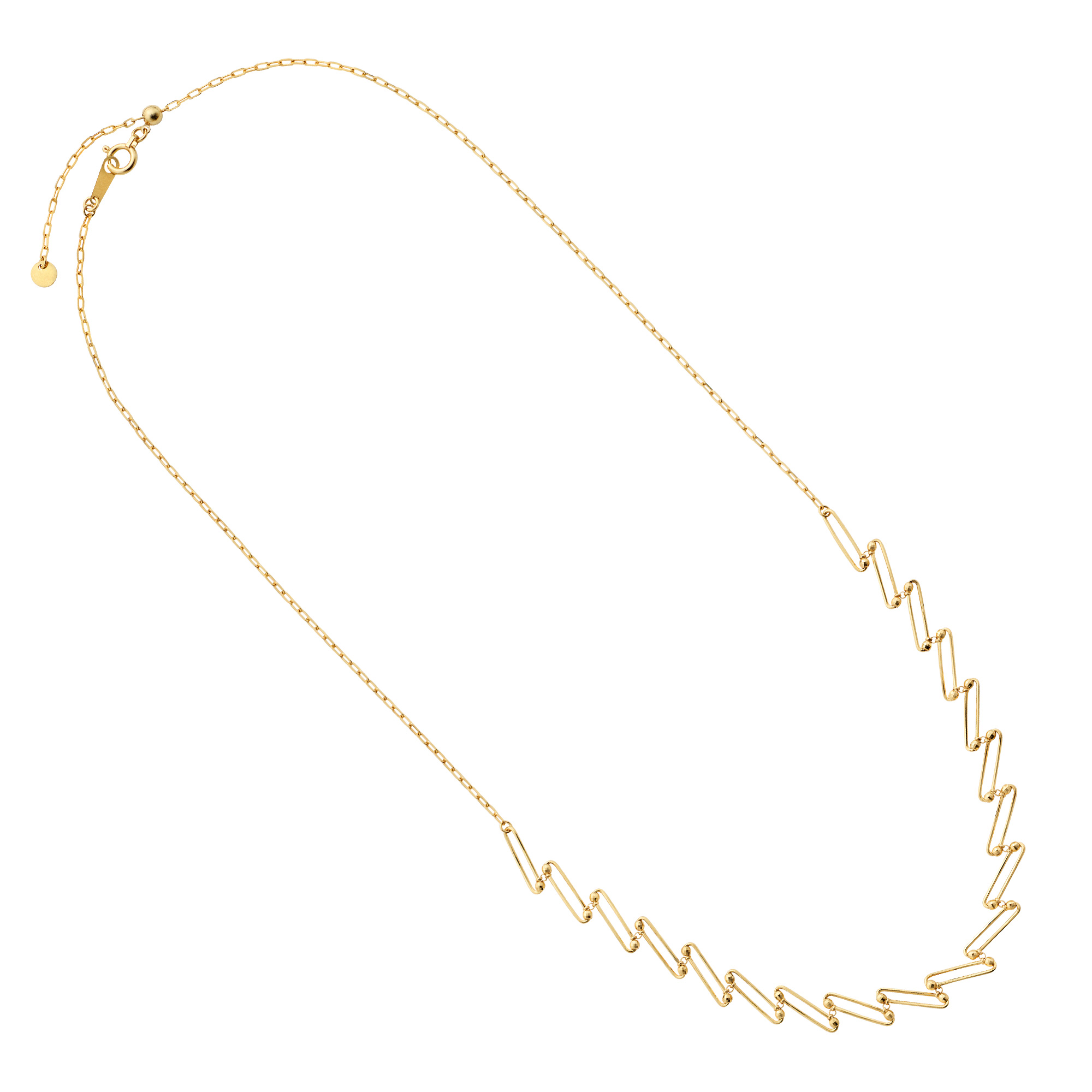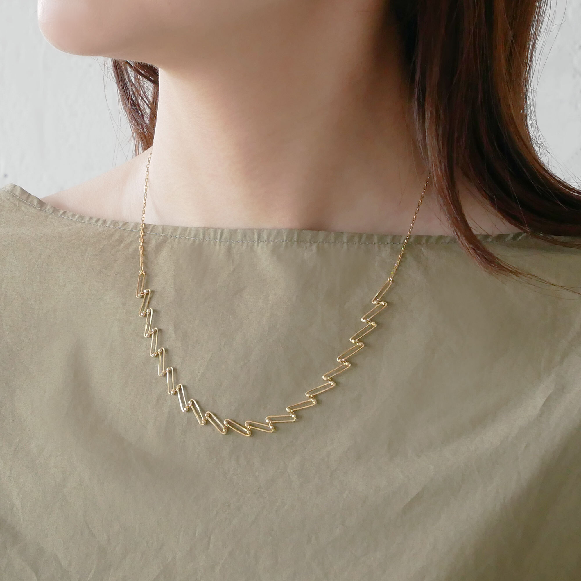 日本を代表する建築家 隈研吾氏と、デザイナー 大村真有美氏のデザインユニット。新感覚で身近なアート、ライフスタイルの実現に取り組む彼らとヴァンドーム青山のコレクションラインです。 岡山県真庭市「GREENable HIRUZEN」内のパビリオン「風の葉」がデザインソース。 木の葉がスパイラル状に舞い上がるイメージからインスピレーションを得た、グラフィカルなジュエリー。 センター部分にゴールドのパーツをジグザグのようなパターンで繋いだチェーンネックレスは、抜け感がありながらたっぷりとしたゴールドの存在感を感じさせる仕上がり。 全てのパーツが可動するデザインはチェーンのようにデコルテに添い、ドラマチックな輝きを放ちます。 ▼シリーズアイテムは こちらKengo Kuma + MA,YU アイテム一覧
