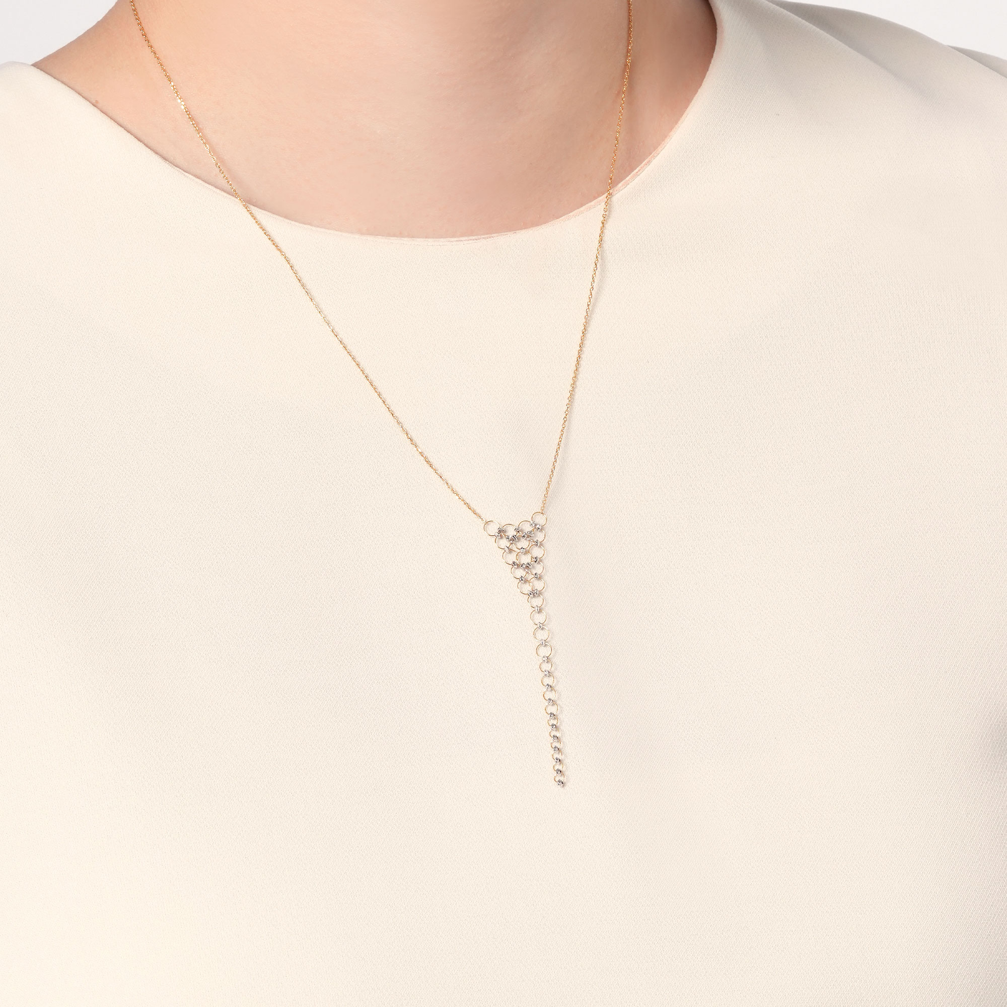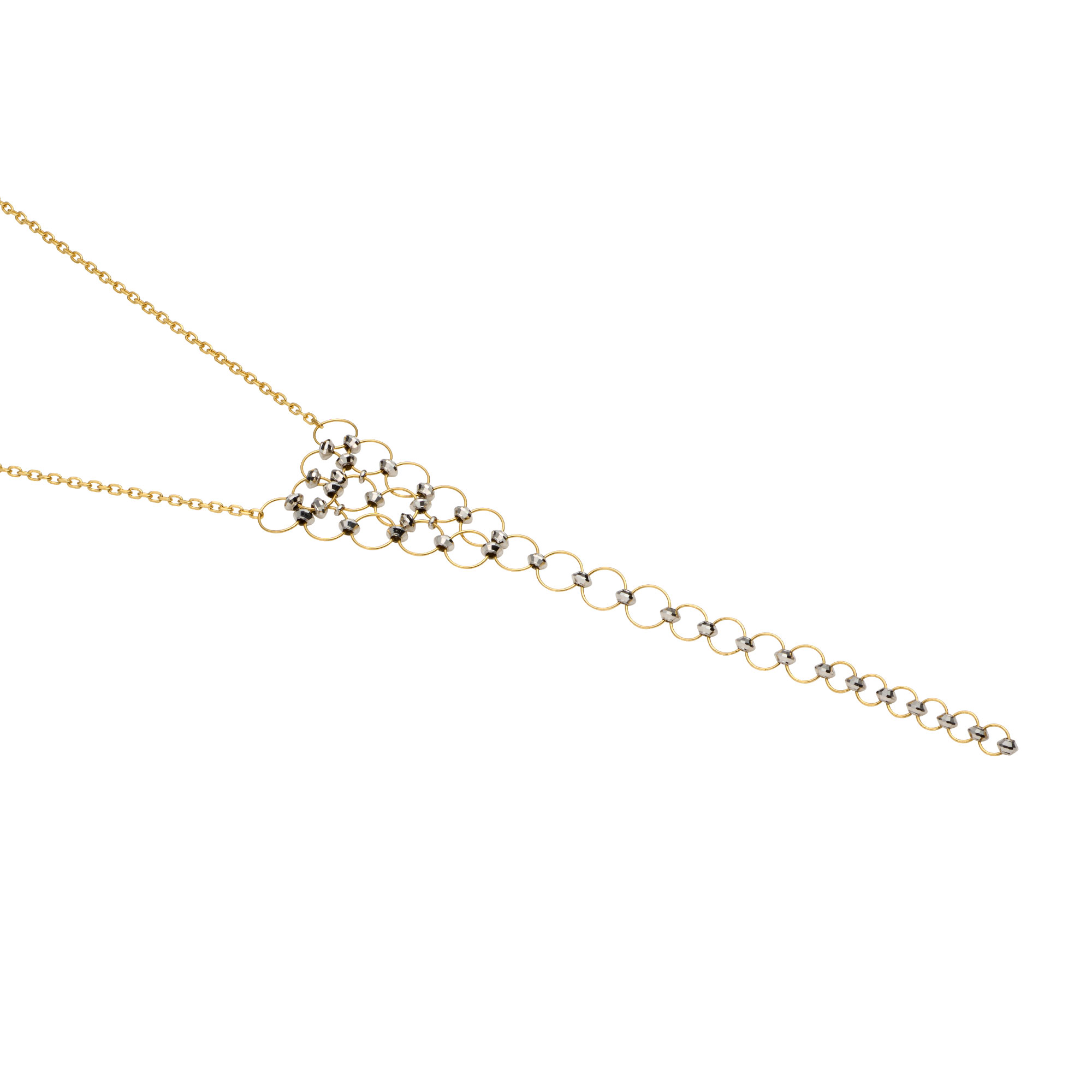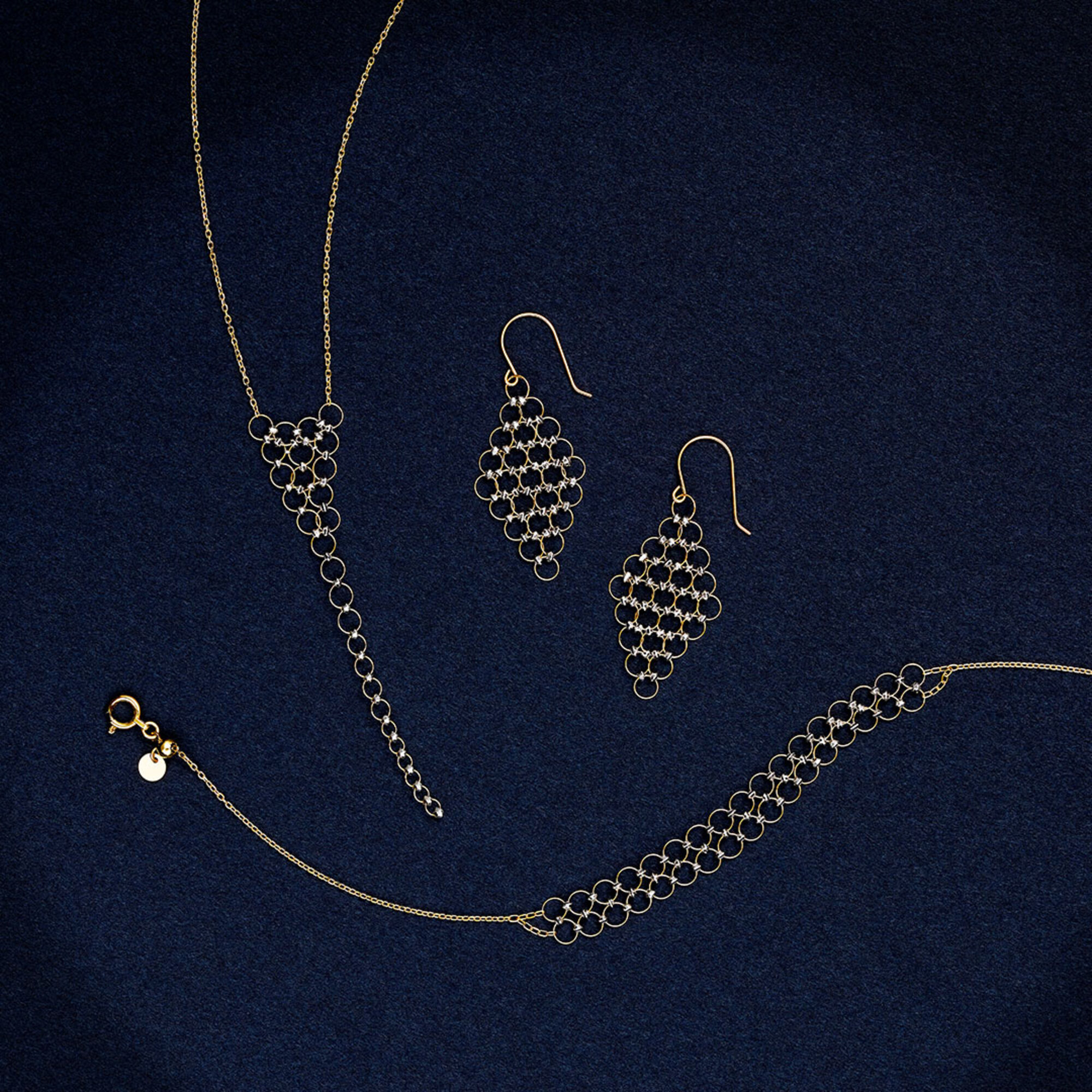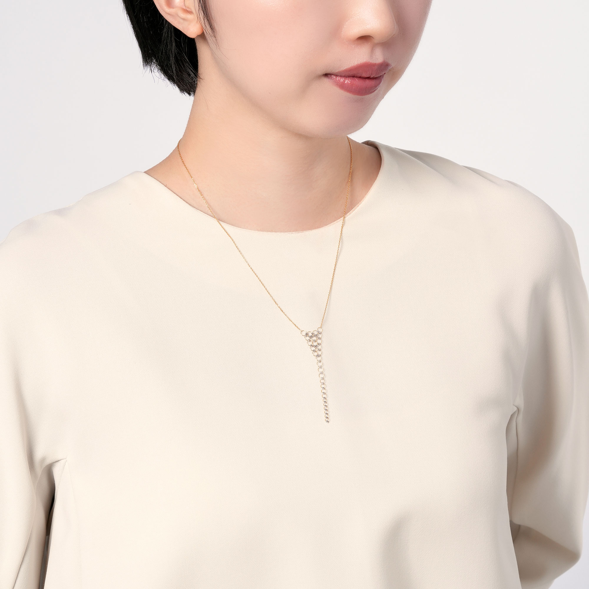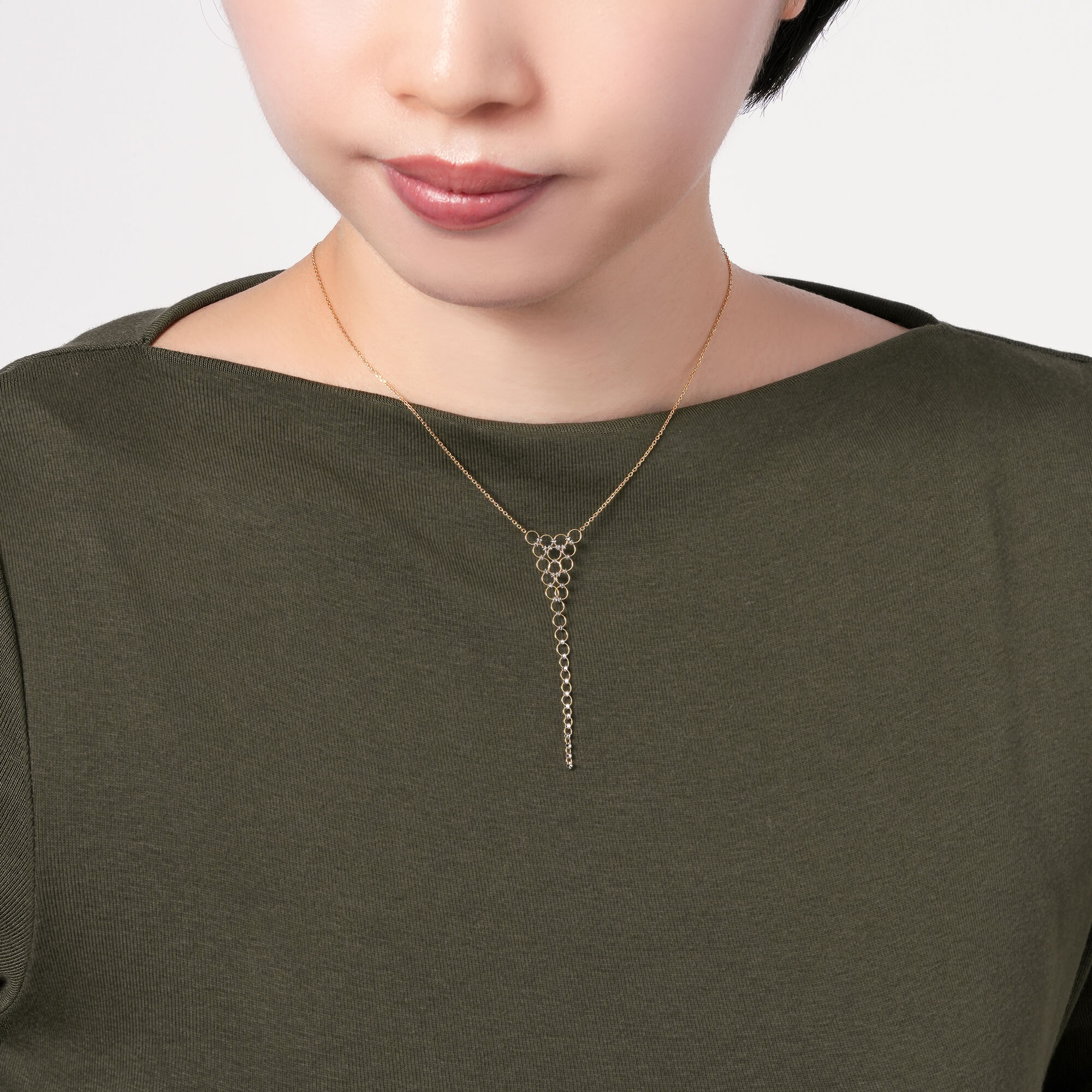 日本を代表する建築家 隈研吾氏と、デザイナー 大村真有美氏のデザインユニット。新感覚で身近なアート、ライフスタイルの実現に取り組む彼らとヴァンドーム青山のコレクションラインです。 東京都武蔵野市・ハモニカ横丁ミタカの廃材である自転車の車輪を使った、ユニークなファサードがデザインソース。 繊細な輪がリンクすることで「面」になる面白さを、ジュエリーで表現しました。 縦横につながったK10イエローゴールドの輪が、なめらかに動き、布のような表情を見せます。 ジョイント部分にはK10ホワイトゴールドのビーズをあしらい、輝きのアクセントに。 デコルテにしなやかに添うネックレスは縦に長いラインで、胸元にドラマチックな輝きを添えます。 ▼シリーズアイテムはこちらLink シリーズKengo Kuma + MA,YU アイテム一覧