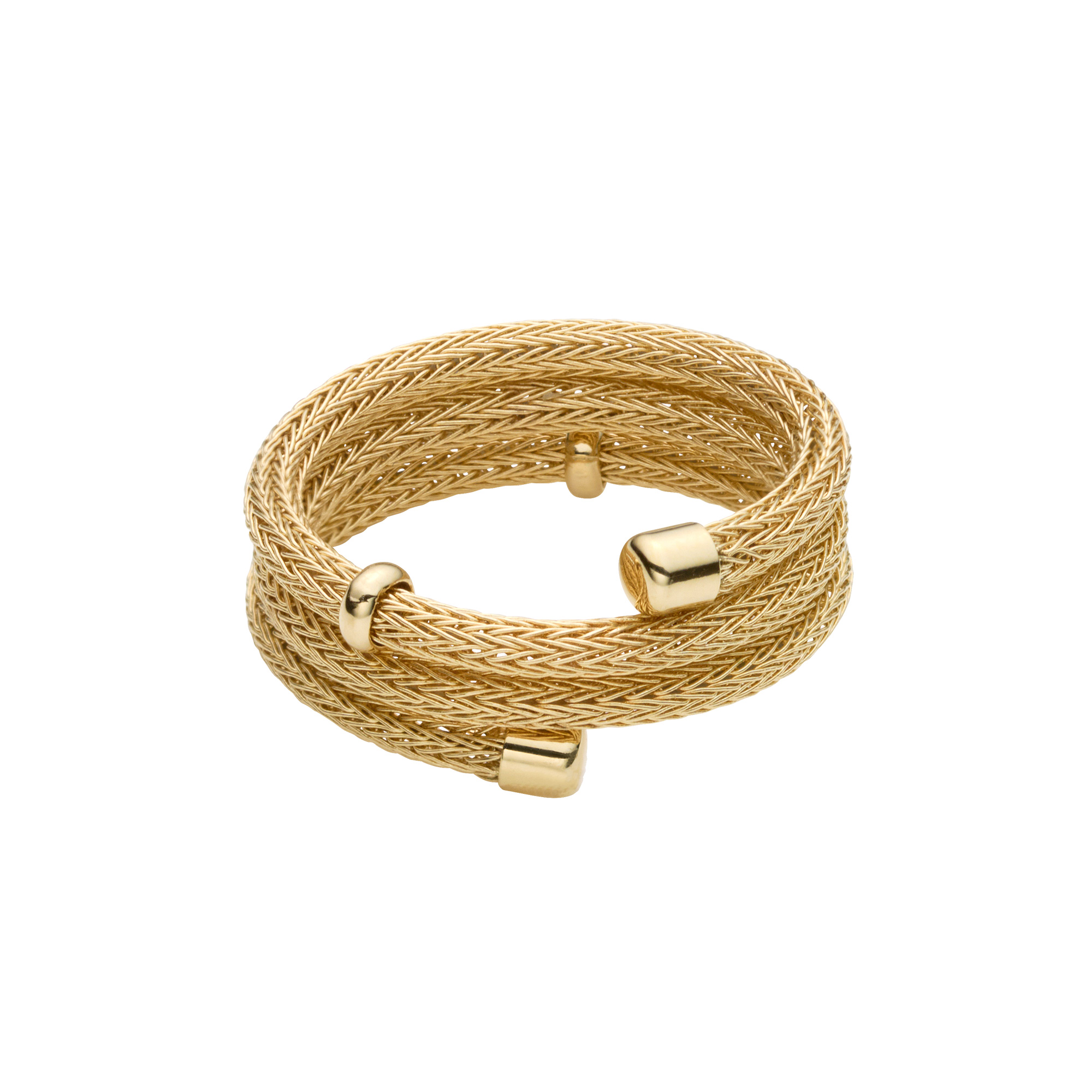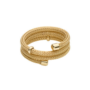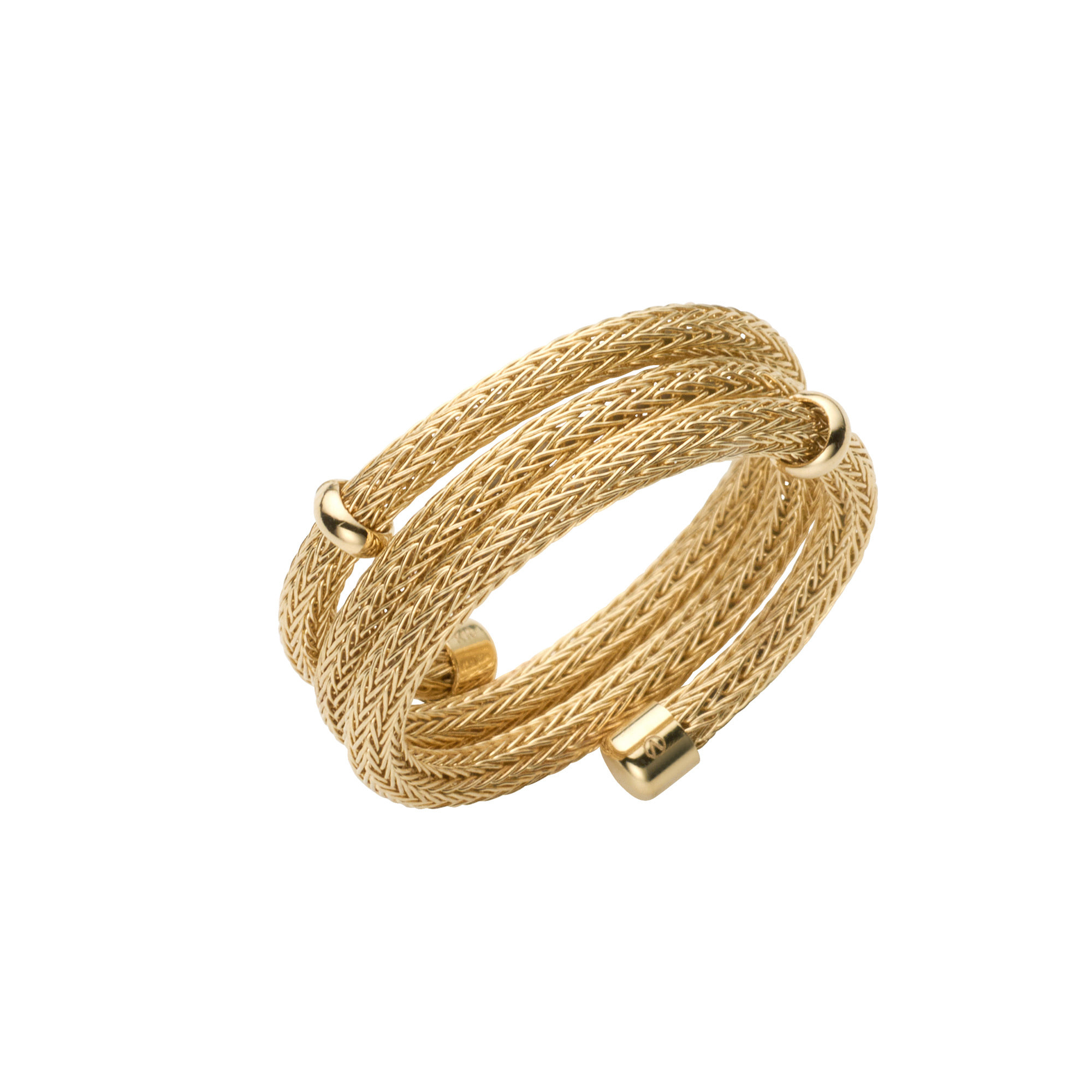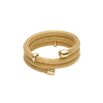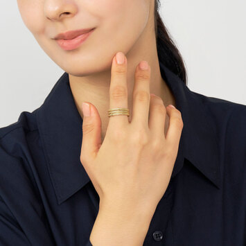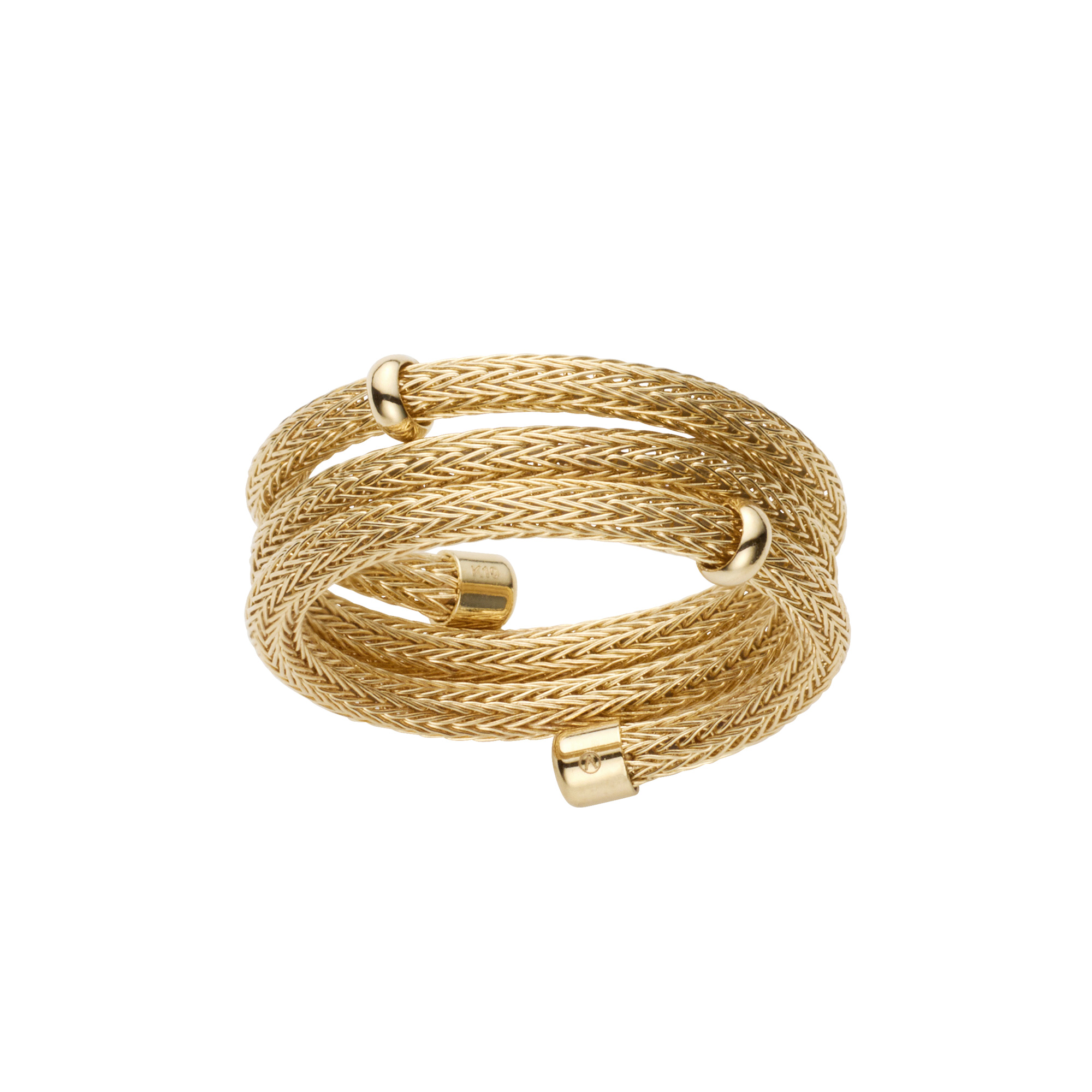 日本を代表する建築家 隈研吾氏と、デザイナー 大村真有美氏のデザインユニット。 新感覚で身近なアート、ライフスタイルの実現に取り組む彼らとヴァンドーム青山のコレクションラインです。 木板にレーザーカッターで切込みを入れることで蛇のような柔軟性を持たせたパビリオン「Uro-Co」がデザインソース。 K10イエローゴールドで作られたしなやかなチューブを、形状記憶の技術をつかってジュエリーに仕立てました。 スパイラル状のリングは、見た目のボリュームに反して軽く柔軟性があり、ぴったりと指にフィットします。 フリーサイズ(着用感:約13〜15号)で、お好きな指にお着けいただけるフレキシブルさも魅力です。 鱗のような編みのテクスチャーは、金属でありながら生地のようなさらりとした肌触り。 控えめなツヤがヴィンテージのような、こなれた雰囲気を演出してくれます。 さらに、ポイントであしらわれたリング状のパーツがきらりと光るアクセントになっています。 ▼シリーズアイテムはこちらUro-Co シリーズKengo Kuma + MA,YU アイテム一覧