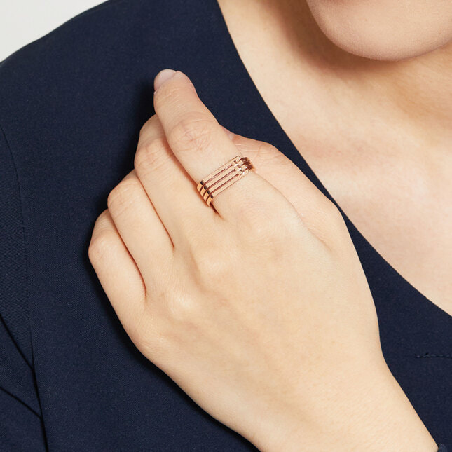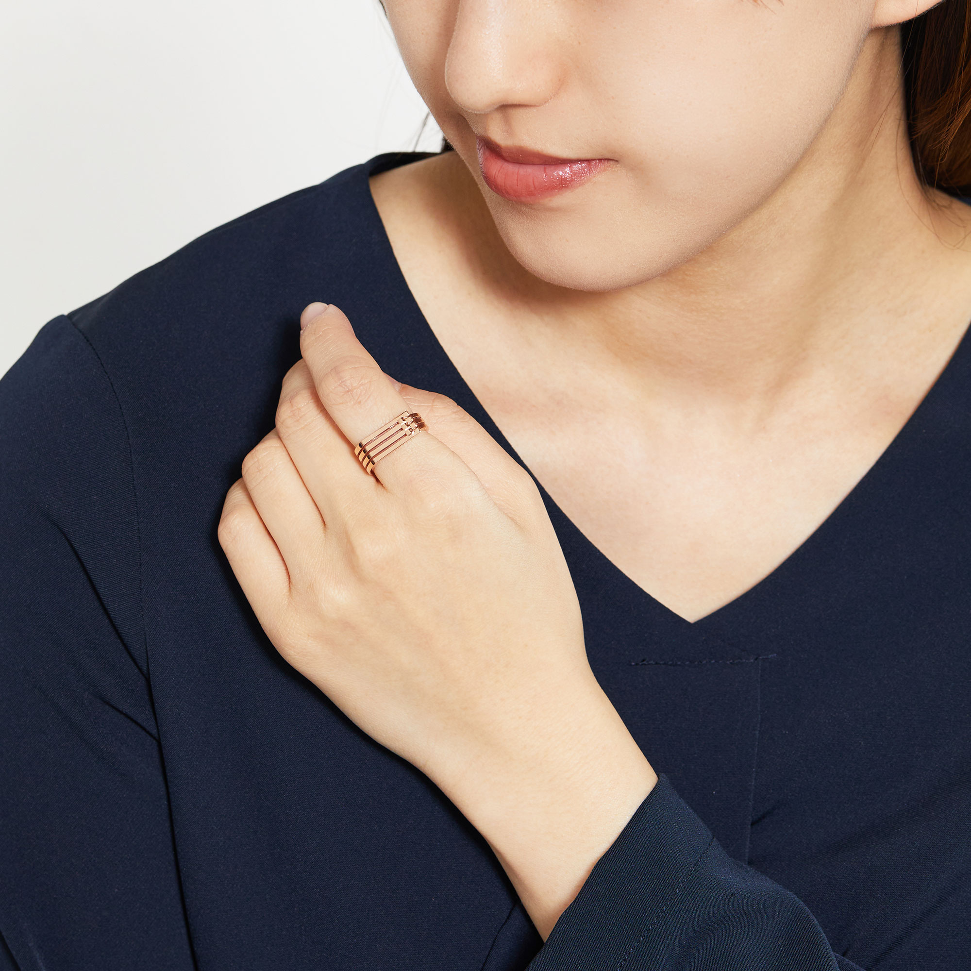 日本を代表する建築家 隈研吾氏と、デザイナー 大村真有美氏のデザインユニット。 新感覚で身近なアート、ライフスタイルの実現に取り組む彼らとヴァンドーム青山のコレクションラインです。 トルコの古都、エスキシェヒルに建つ「Odunpazarı Modern Museum」がデザインソース。 隈建築の代表的なディティールであるルーバーをモダンなジュエリーに仕立てました。 水平方向のルーバーと木組みを思わせるデザインがスタイリッシュなリング。 等間隔に入ったスリットで、幅広のリングでも程よい抜け感があり、着けやすいサイズ感です。 ピンクゴールドのツヤが手元に華やかさを添えます。 ジェンダーレスなデザインは同シリーズでペアリングとしてお使いいただくのもおすすめです。 ▼シリーズアイテムは こちらKengo Kuma + MA, YU アイテム一覧
