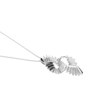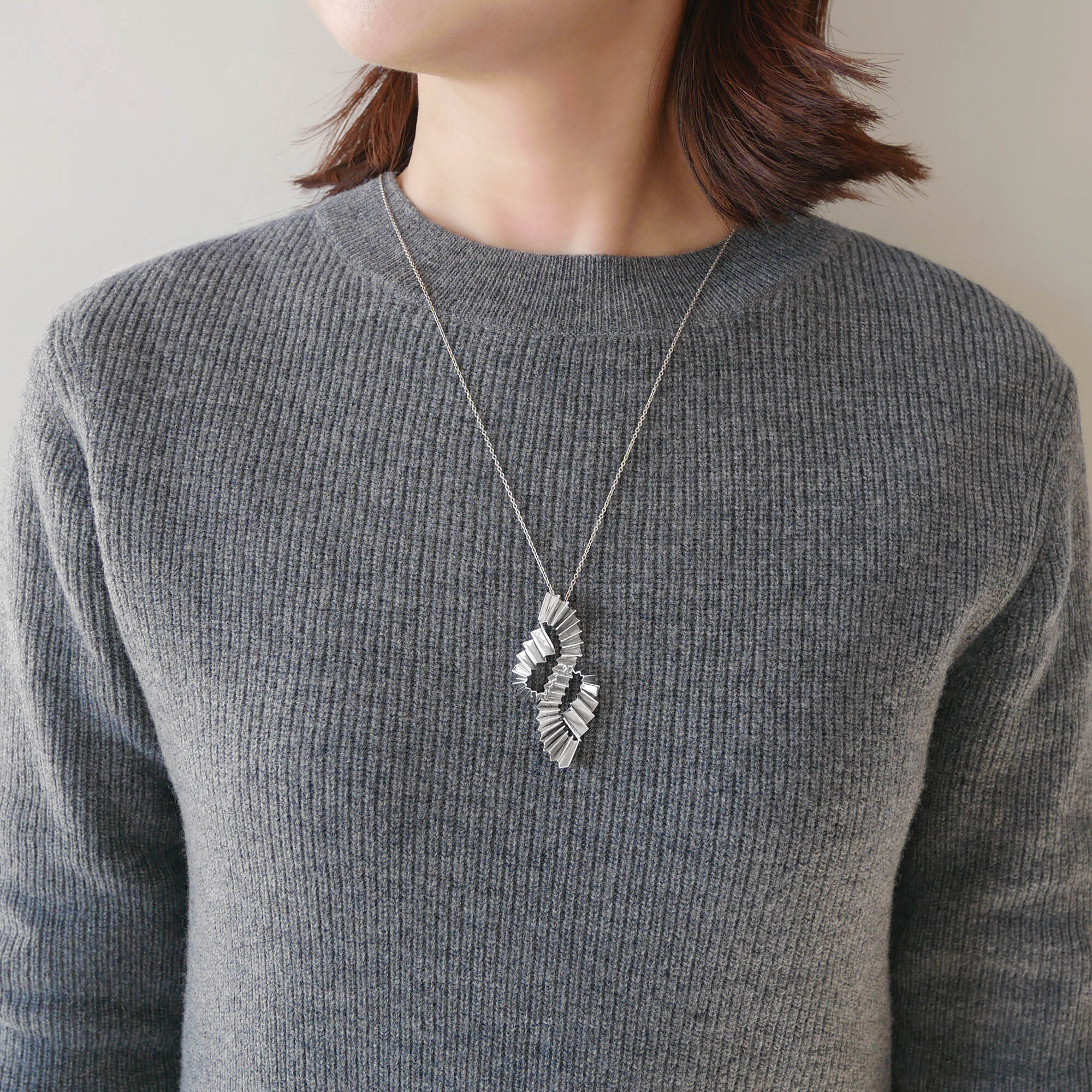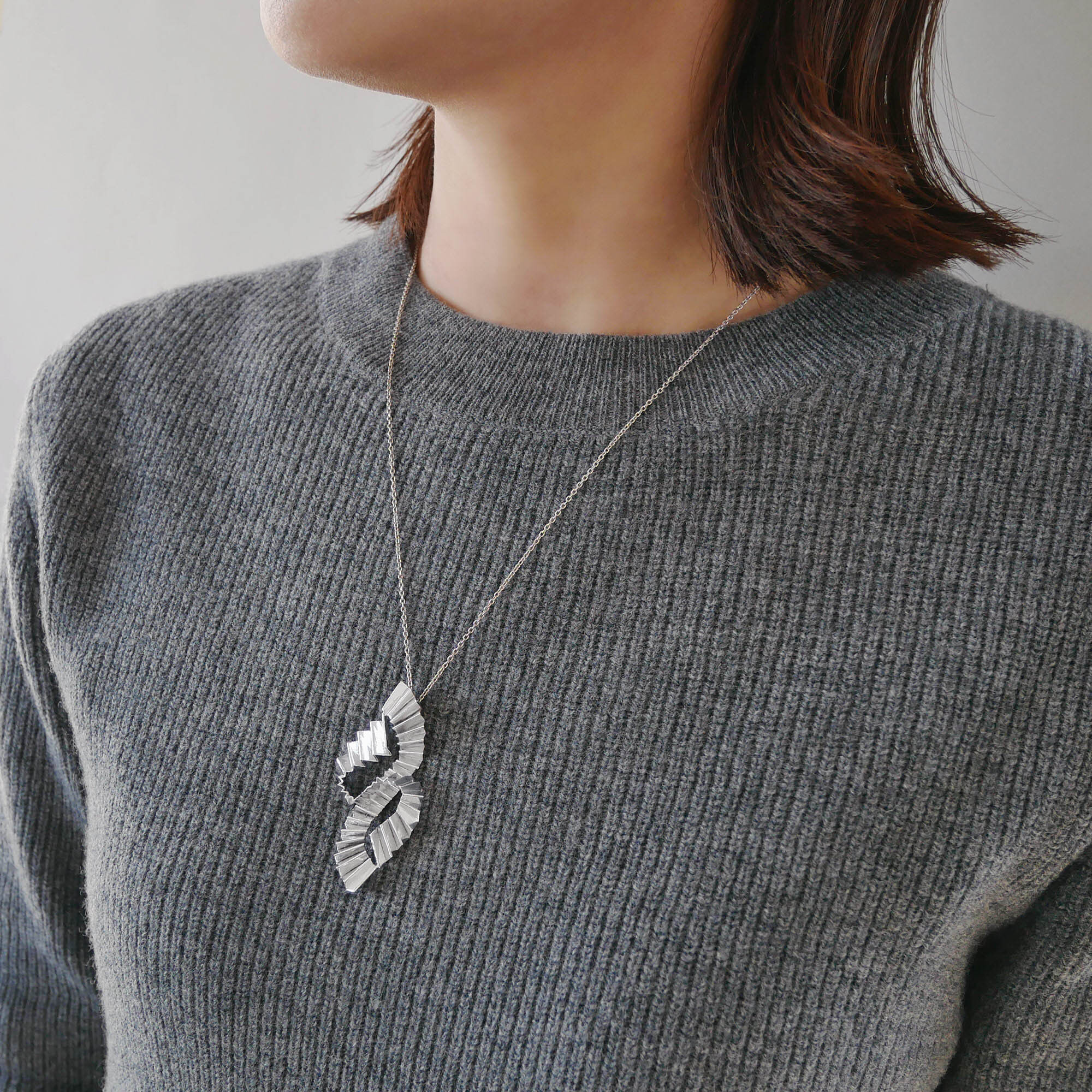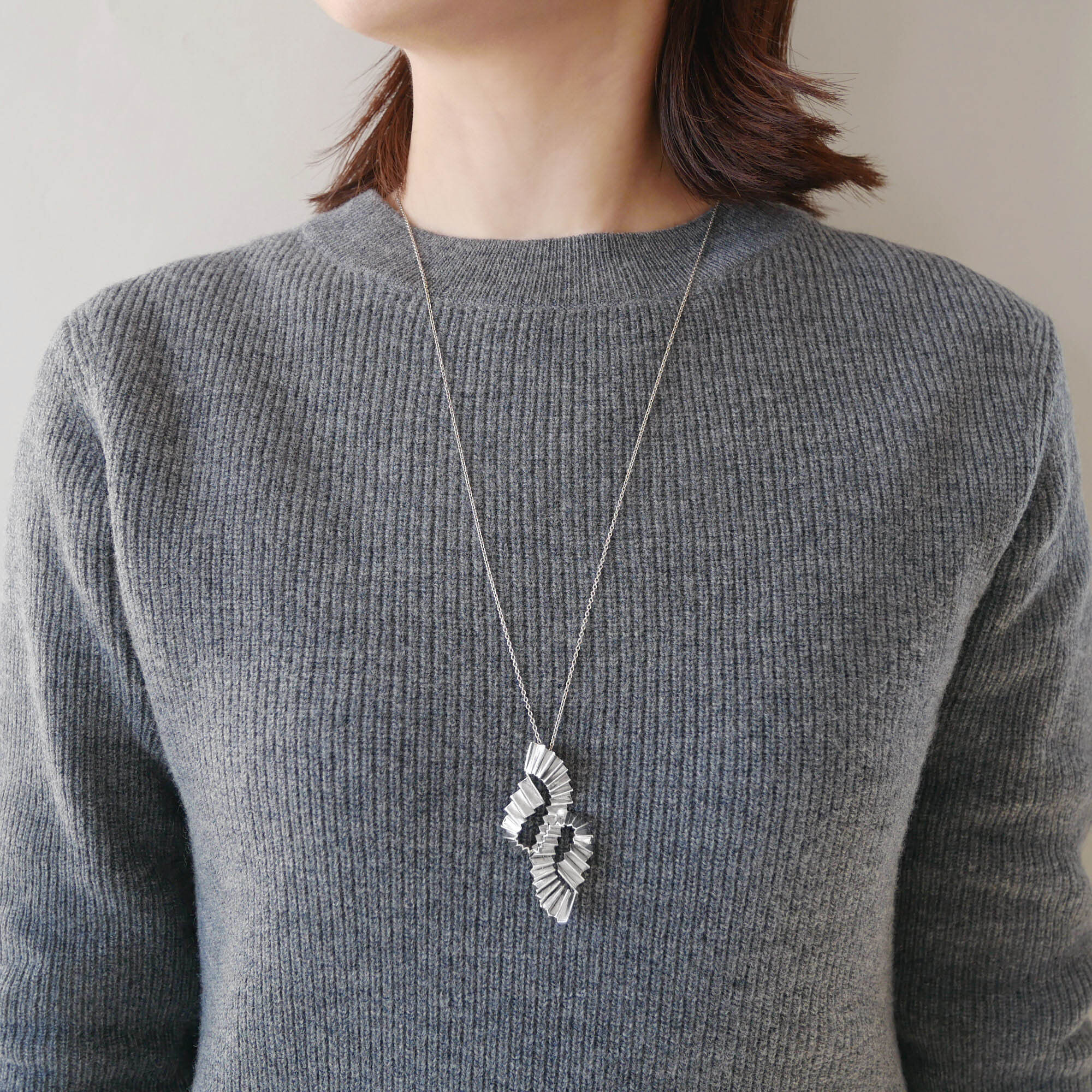 日本を代表する建築家 隈研吾氏と、デザイナー 大村真有美氏のデザインユニット。新感覚で身近なアート、ライフスタイルの実現に取り組む彼らとヴァンドーム青山のコレクションラインです。 隈研吾氏がミラノデザインウィークで発表した「Breath/ng」(ブリージング)がデザインソース。 柔らかくサスティナブルなインスタレーションをシルバージュエリーで大胆に表現したネックレス。 少しテクスチャーのあるシルバーの表面はハーフマットのような輝きを放ち、大振りのトップと長めのチェーンは旬のムード満載です。 スライドアジャスターで簡単に長さ調節ができ、これ一つで、コーディネートがオシャレに決まります。 ▼シリーズアイテムはこちらBreath/ng シリーズKengo Kuma + MA, YU by Vendome Aoyama