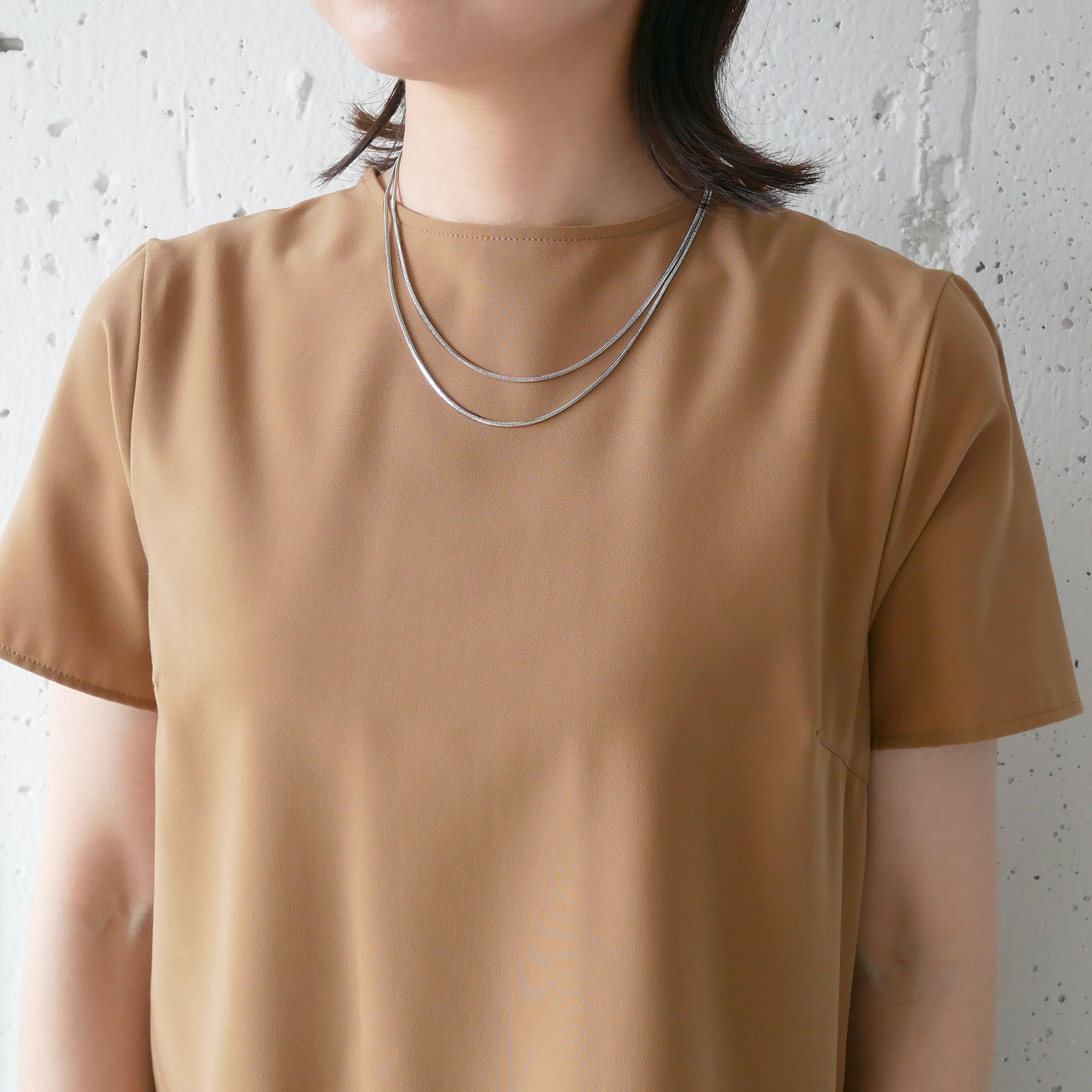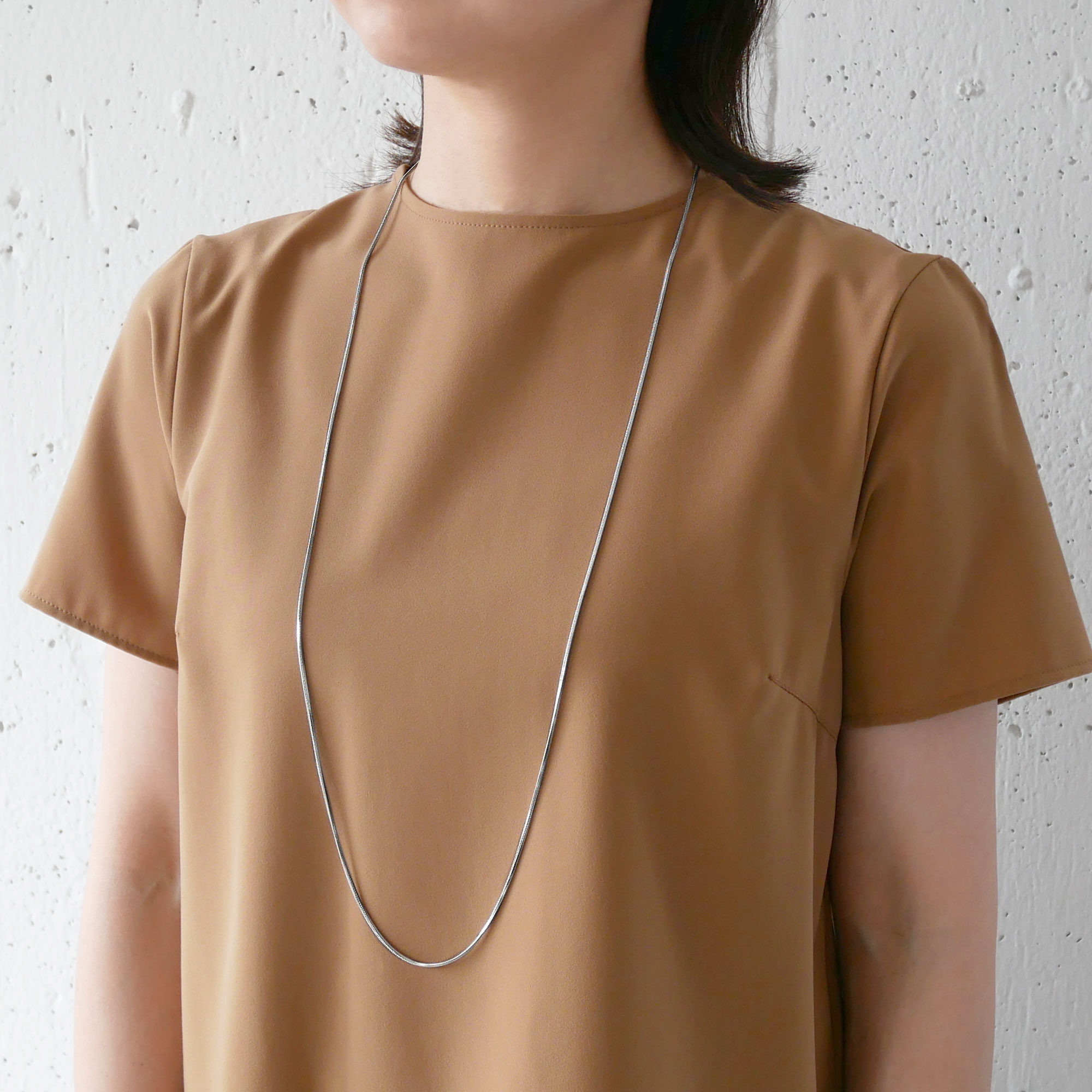 日本を代表する建築家 隈研吾氏と、デザイナー 大村真有美氏のデザインユニット。 新感覚で身近なアート、ライフスタイルの実現に取り組む彼らとヴァンドーム青山のコレクションラインです。 隈建築のアーチをデザインソースにしたシリーズ。 90cmの角スネークを使ったロングチェーンネックレス。 スネークチェーンは、たわんだ時のアーチのフォルムが美しく出るチェーンです。 ロングで1本で着けてもさまになりますし、着用画像のように2重に巻いてもねじれたりすることなく、きれいにお着けいただけます。 程よいつや感とボリュームは、無地のお洋服はもちろん、柄物に合わせても負けない存在感があります。 ▼サイズバリエーションはこちらネックレス(全長:約60cm) ▼シリーズアイテムは こちらKengo Kuma + MA, YU アイテム一覧