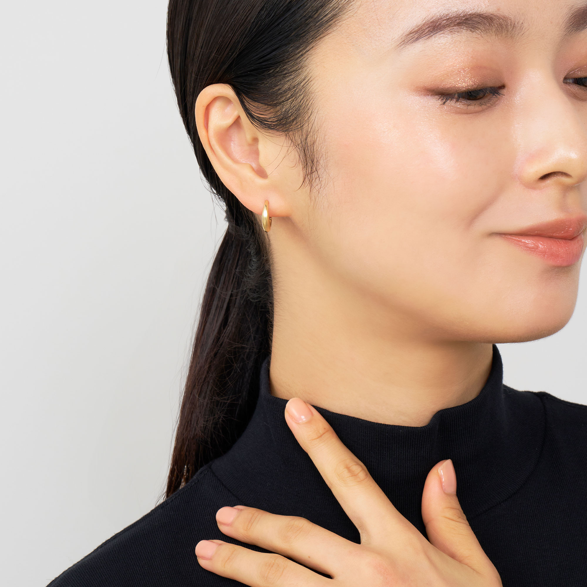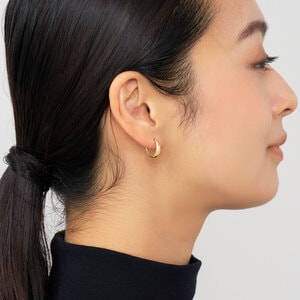 日本を代表する建築家 隈研吾氏と、デザイナー 大村真有美氏のデザインユニット。新感覚で身近なアート、ライフスタイルの実現に取り組む彼らとヴァンドーム青山のコレクションラインです。 隈研吾氏がスパゲティから空間の発想を得たシリーズ。 無駄のないフォルムが洗練された印象のキャッチレスピアス。 シンプルながら洗練されたカーブを描くイエローゴールドのフープが横顔に華やかさをプラスします。 しっかりと留まるバネ式の金具は着脱が簡単で、キャッチを引っかけたり、落としたりする心配もありません。バックスタイルもスッキリ。 程よいサイズでデイリーに活躍するおすすめアイテムです。 ▼カラーバリエーションはこちらホワイトゴールド ▼シリーズアイテムはこちらKengo Kuma + MA,YU アイテム一覧