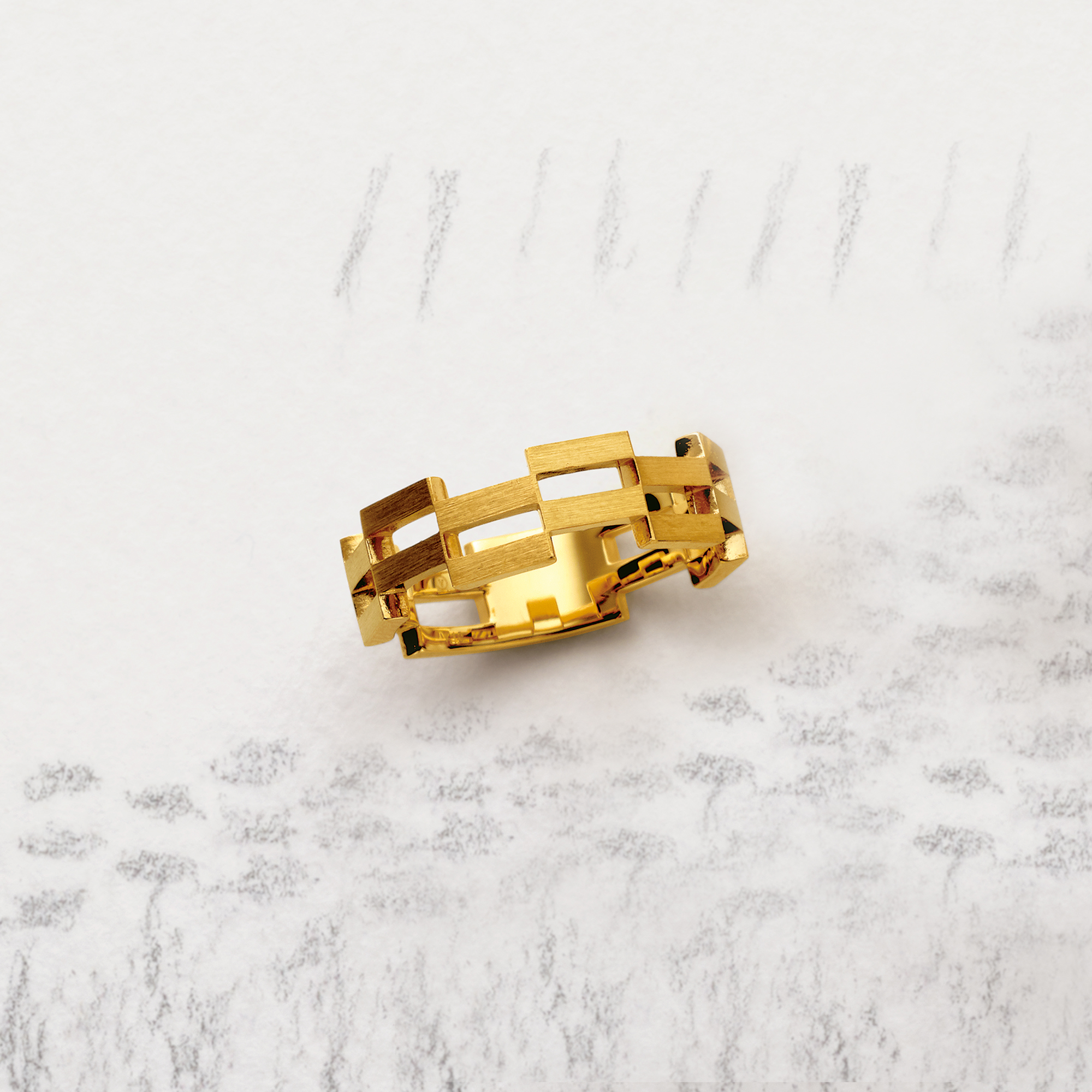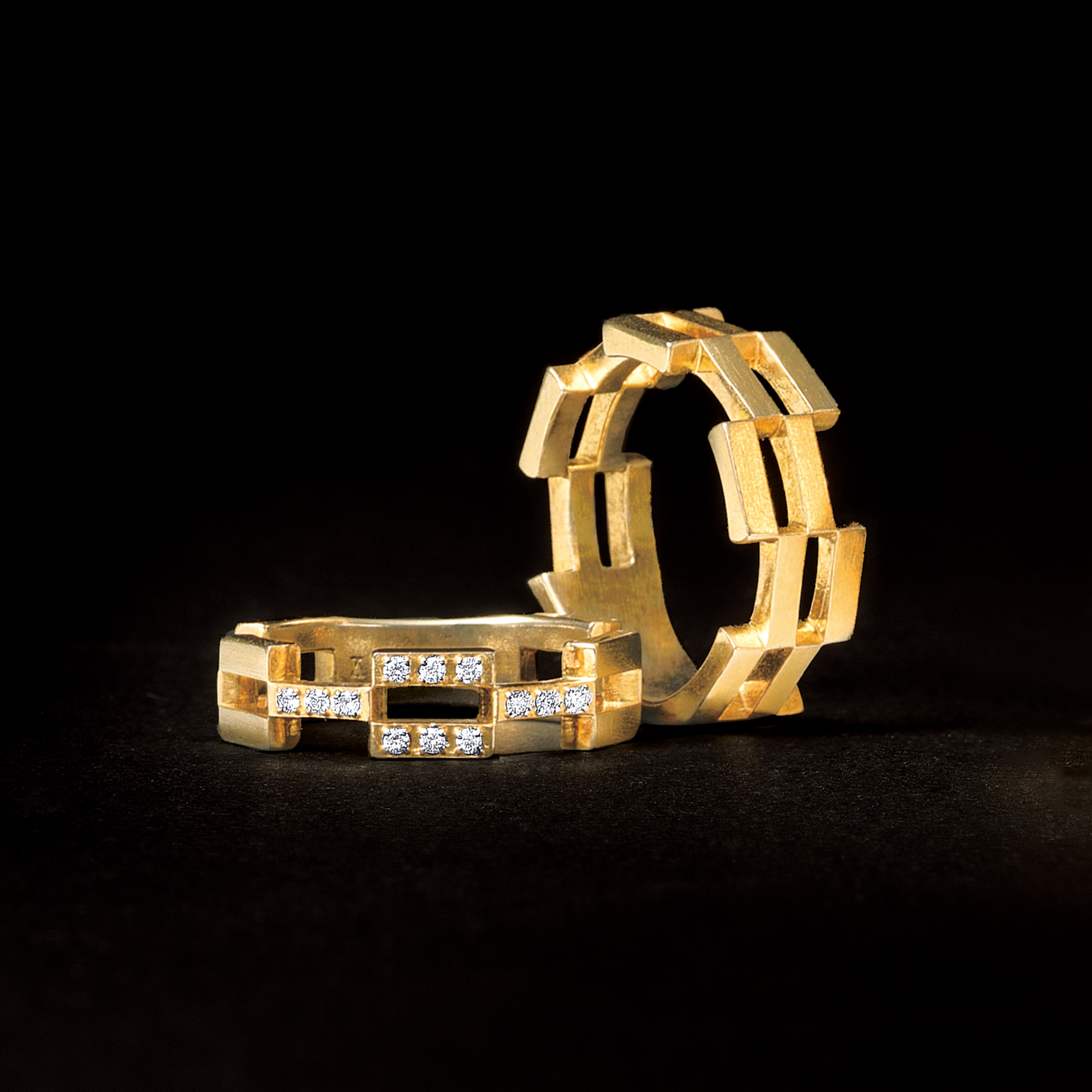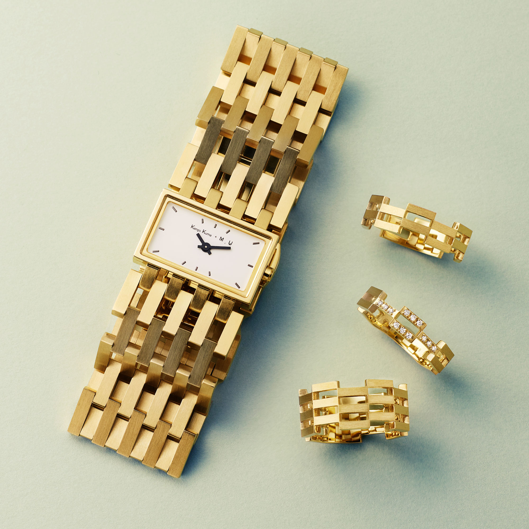 日本を代表する建築家 隈研吾氏と、デザイナー 大村真有美氏。彼らとヴァンドーム青山が創り出す、新感覚のジュエリーコレクションラインです。 規則的なパターンが印象的な隈研吾氏の建築「Lotus House」がデザインソース。 半分透けたリングは建築の意図を踏襲し、ボリュームがありながらも着ける人になじみ、調和します。 素材感のあるヘアラインのテクスチャーは光りすぎずアーティスティックな雰囲気。 ジェンダーレスなデザインは女性が着ければモダンで華やかに、男性が着ければクールでスタイリッシュに手元を演出します。 ペアでお使いいただくのもおすすめです。 ▼カラーバリエーションはこちらホワイトゴールド ▼シリーズアイテムは こちらKengo Kuma + MA, YU アイテム一覧