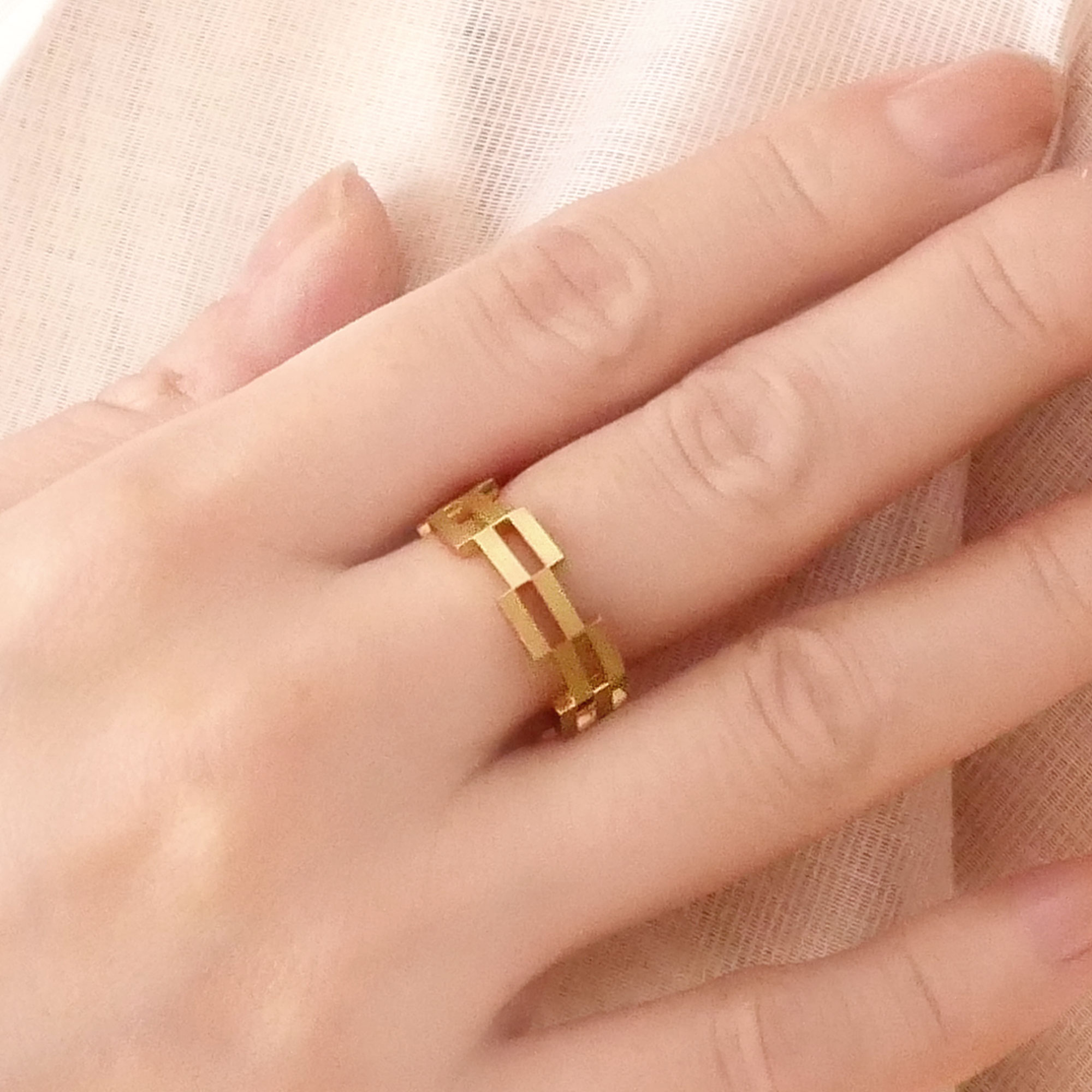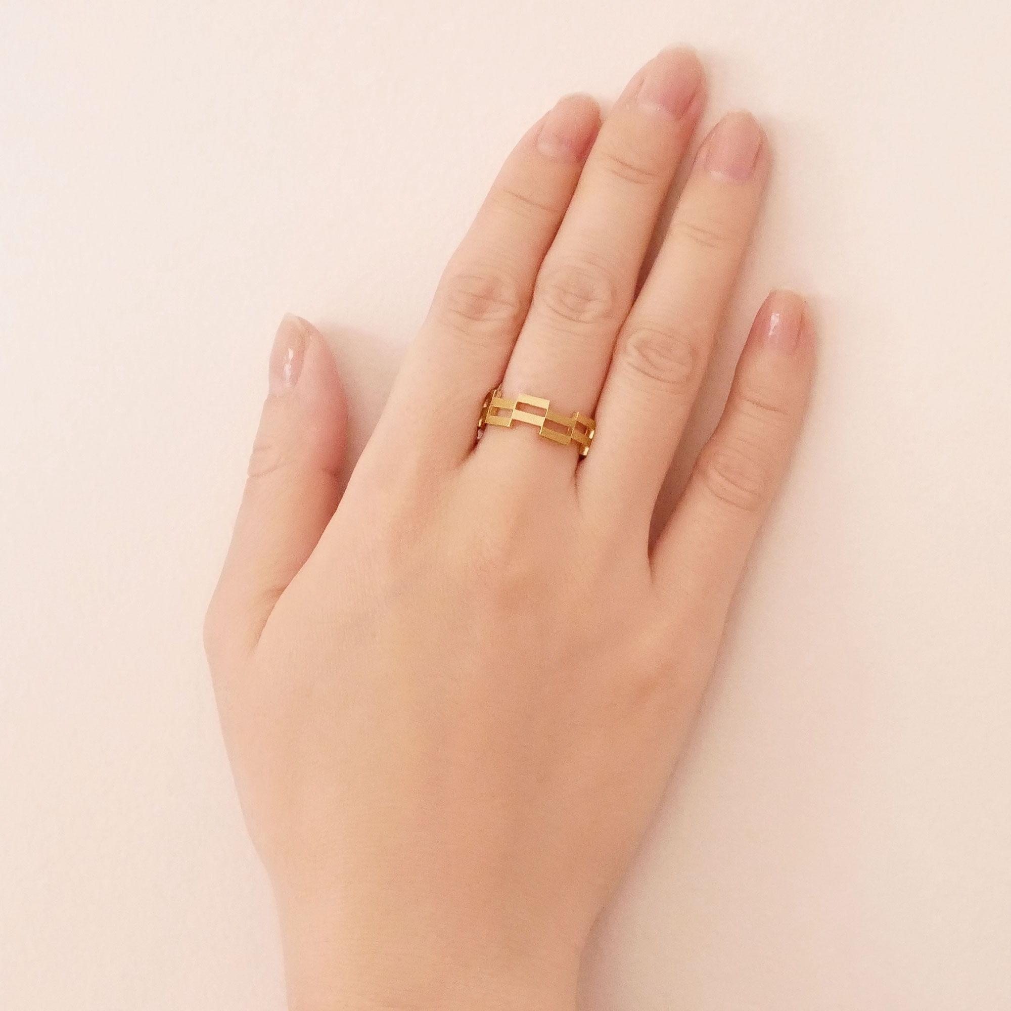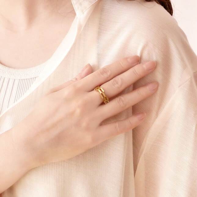 日本を代表する建築家 隈研吾氏と、デザイナー 大村真有美氏。彼らとヴァンドーム青山が創り出す、新感覚のジュエリーコレクションラインです。 規則的なパターンが印象的な隈研吾氏の建築「Lotus House」がデザインソース。 半分透けたリングは建築の意図を踏襲し、ボリュームがありながらも着ける人になじみ、調和します。 素材感のあるヘアラインのテクスチャーは光りすぎずアーティスティックな雰囲気。 ジェンダーレスなデザインは女性が着ければモダンで華やかに、男性が着ければクールでスタイリッシュに手元を演出します。 ペアでお使いいただくのもおすすめです。 ▼カラーバリエーションはこちらホワイトゴールド ▼シリーズアイテムは こちらKengo Kuma + MA, YU アイテム一覧