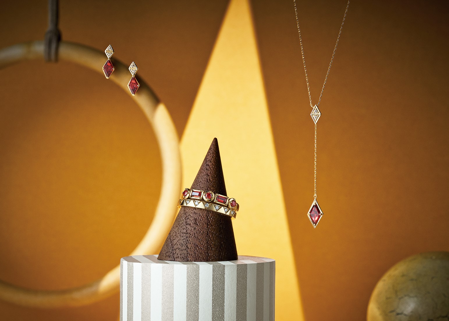 深みのあるガーネットの赤とダイヤモンドの煌めきが調和したジュエリー。毎年人気のセットリングや表情に変化を出せる“ラブル”ネックレスを、菱形など幾何学の石のフォルムが洗練された印象に。セットリング[K18YG×ガーネット×ダイヤモンド] 2wayネックレス[K18YG ×ガーネット×ブラウンダイヤモンド] ピアス[K18YG ×ガーネット×ブラウンダイヤモンド]