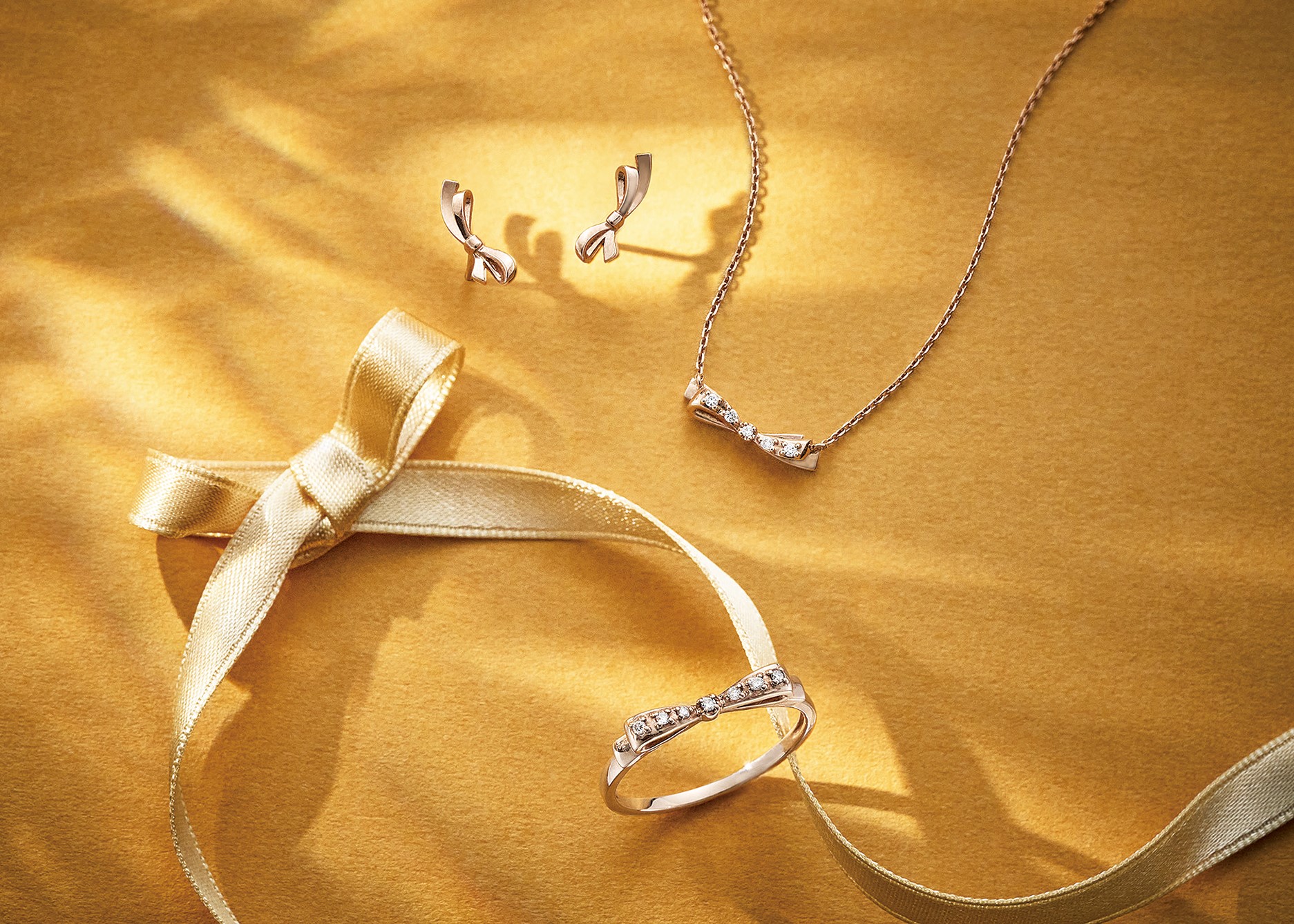 トレンドのリボンモチーフを、動きを持たせて立体的に表現。モチーフが小さいので甘さも抑えめ。ネックレス[K10PG×ダイヤモンド] ピアス[K10PG] リング[K10PG×ダイヤモンド]