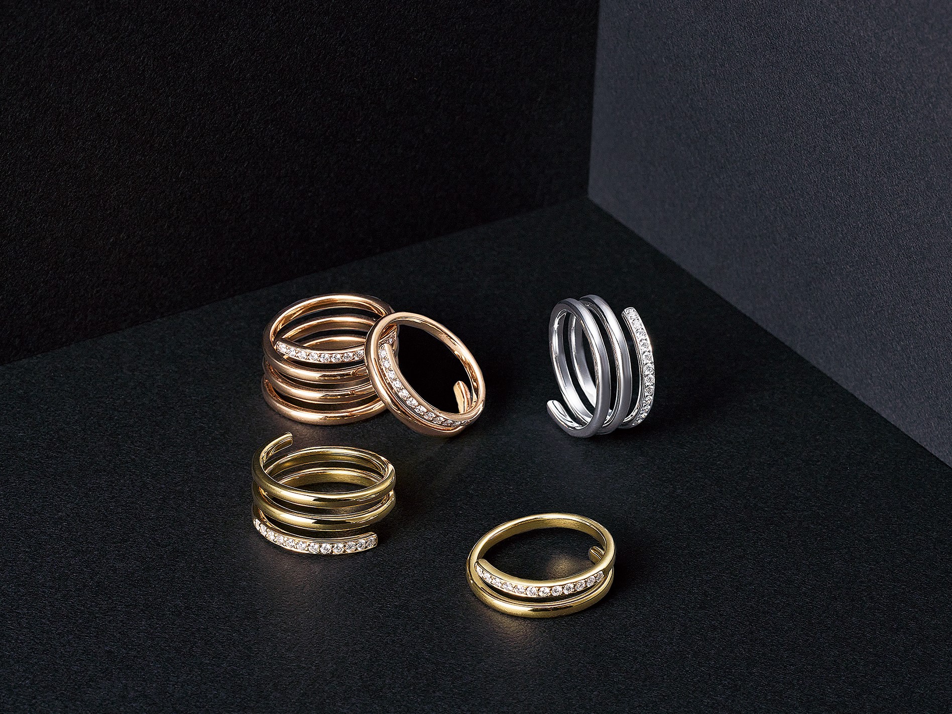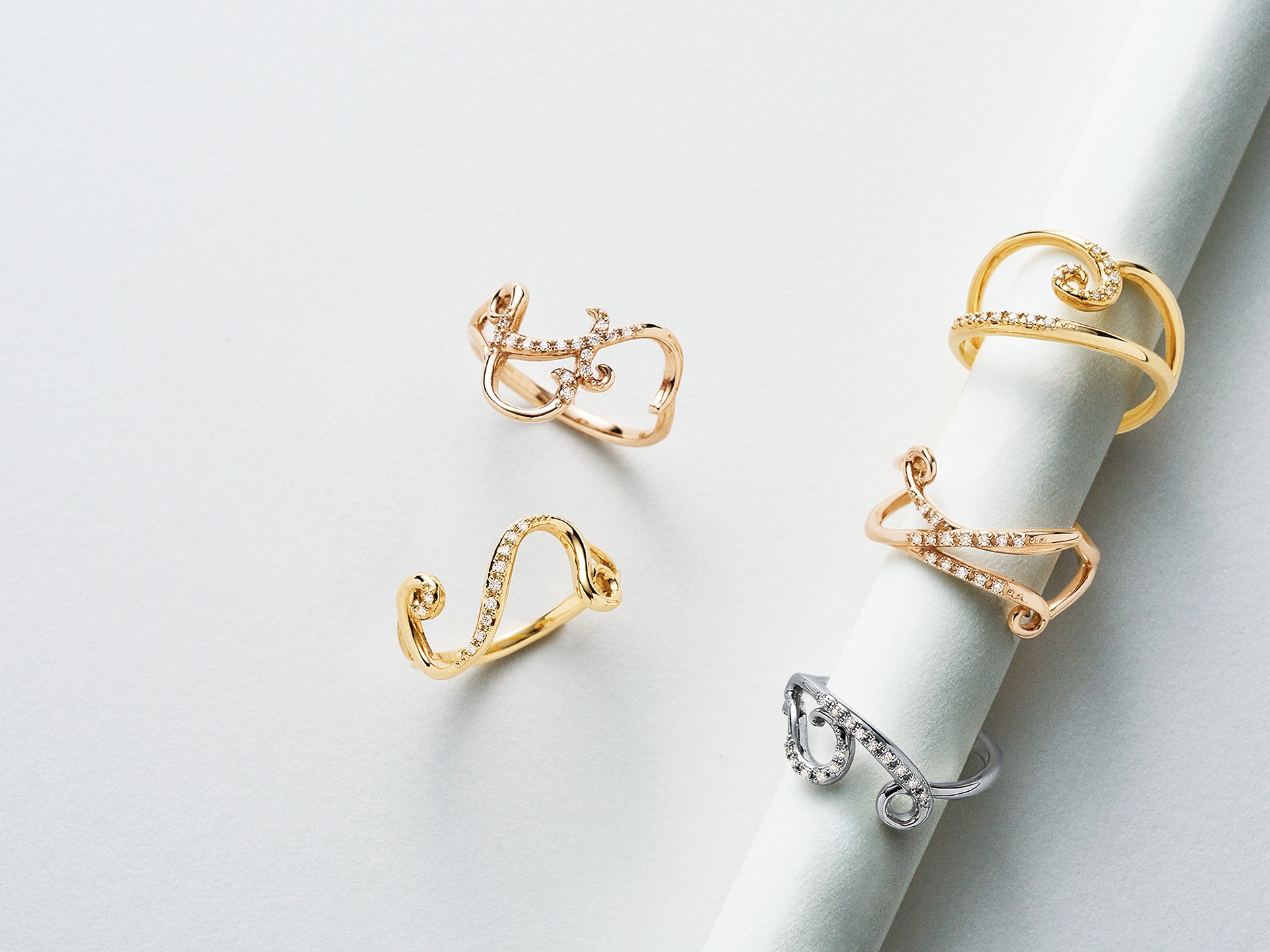 らせんをかたどったボリューム感がエレガントな「トゥリエール」。優雅な曲線は、まるで人生の物語を描いたかのような繋がりを感じさせるタイムレスなデザイン。3色のゴールドと3 種のボリュームをラインナップ。熟練の職人による美しい磨きの技術で、上品な光沢と滑らかな指あたりに仕上げました。リング〈右上から時計周りに〉[K18WG×ダイヤモンド] [K18YG×ダイヤモンド] [K18YG×ダイヤモンド] [K18PG×ダイヤモンド] [K18PG×ダイヤモンド](すべて伊勢丹新宿店先行発売)