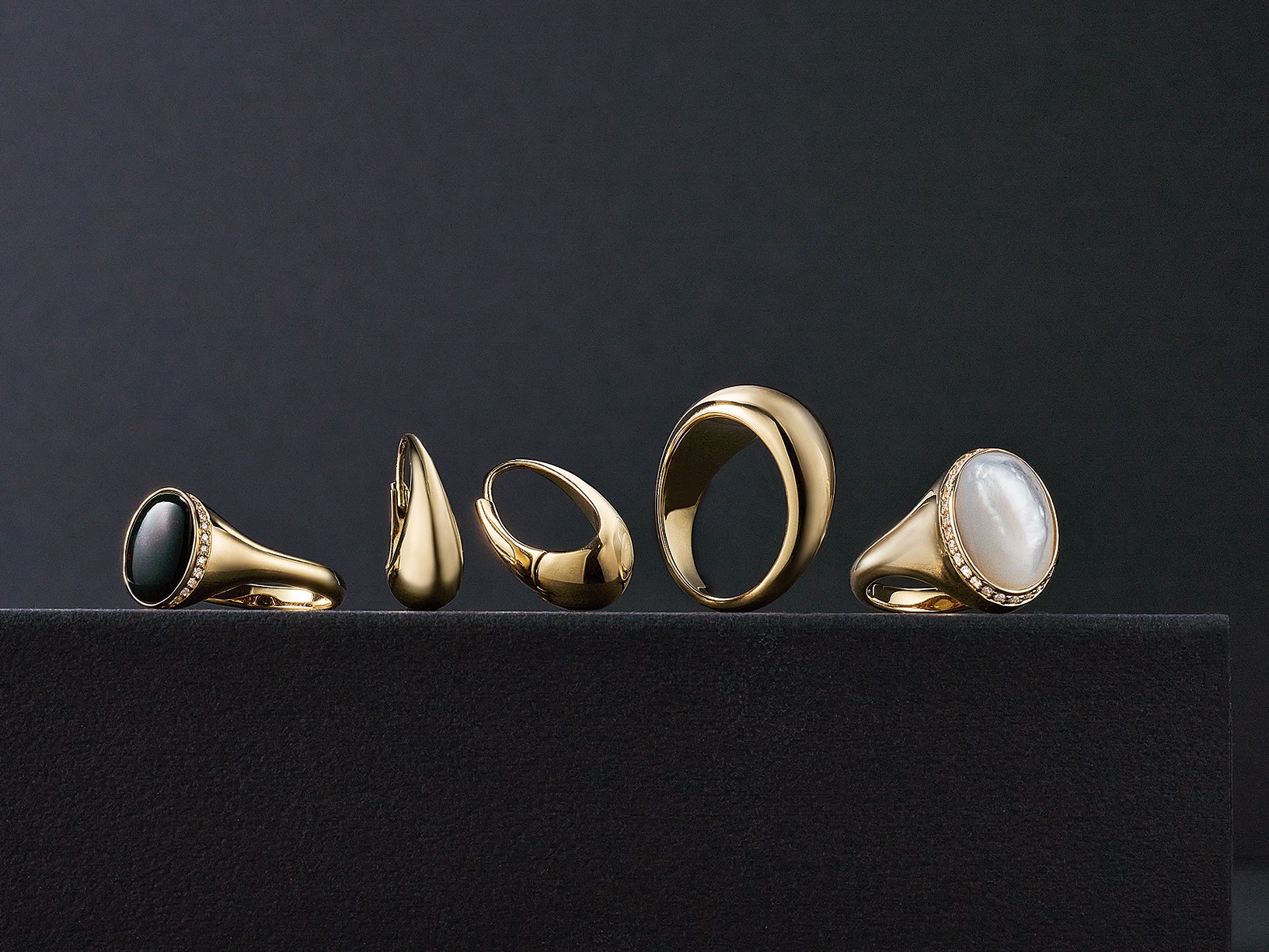 触れたくなるような、丸みのある豊かなフォルムの「マダム・オール」。中央のリングとピアスは中を空洞にすることで軽やかな装着感を実現。2種のストーンはカボションカットで、余裕のある女性に似合う存在感が魅力です。〈右から〉リング[K18YG×シェル×ダイヤモンド] リング[K18YG] ピアス[K18YG] リング[K18YG×ブラッドストーン×ダイヤモンド](すべて伊勢丹新宿店先行発売)