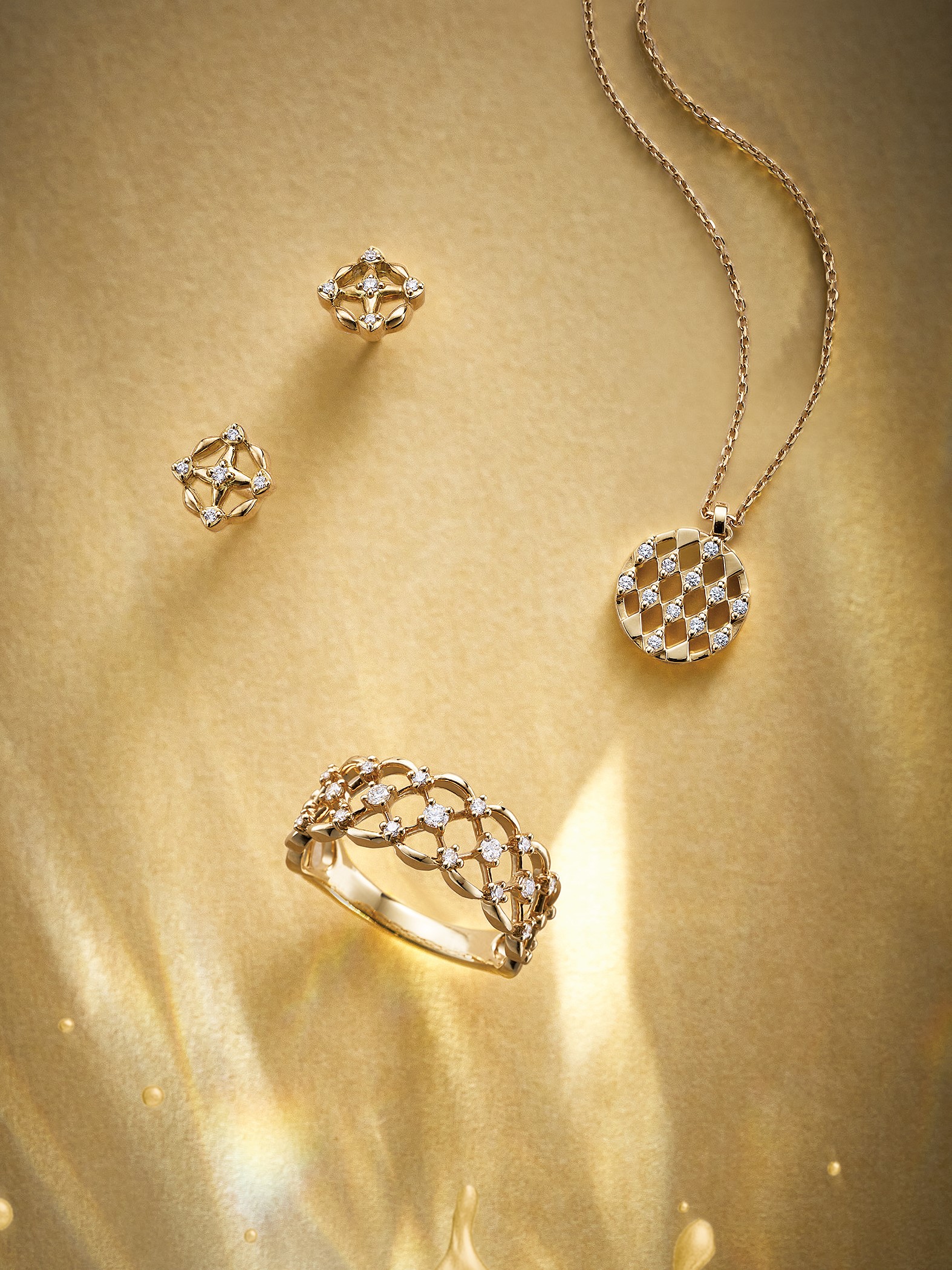 イエローゴールドとダイヤモンドが織りなす、レースのような菱形の透かし模様が特徴。上品でエフォートレスな煌きをまとって。ネックレス[K18YG×ダイヤモンド] リング[K18YG×ダイヤモンド] ピアス[K18YG×ダイヤモンド]