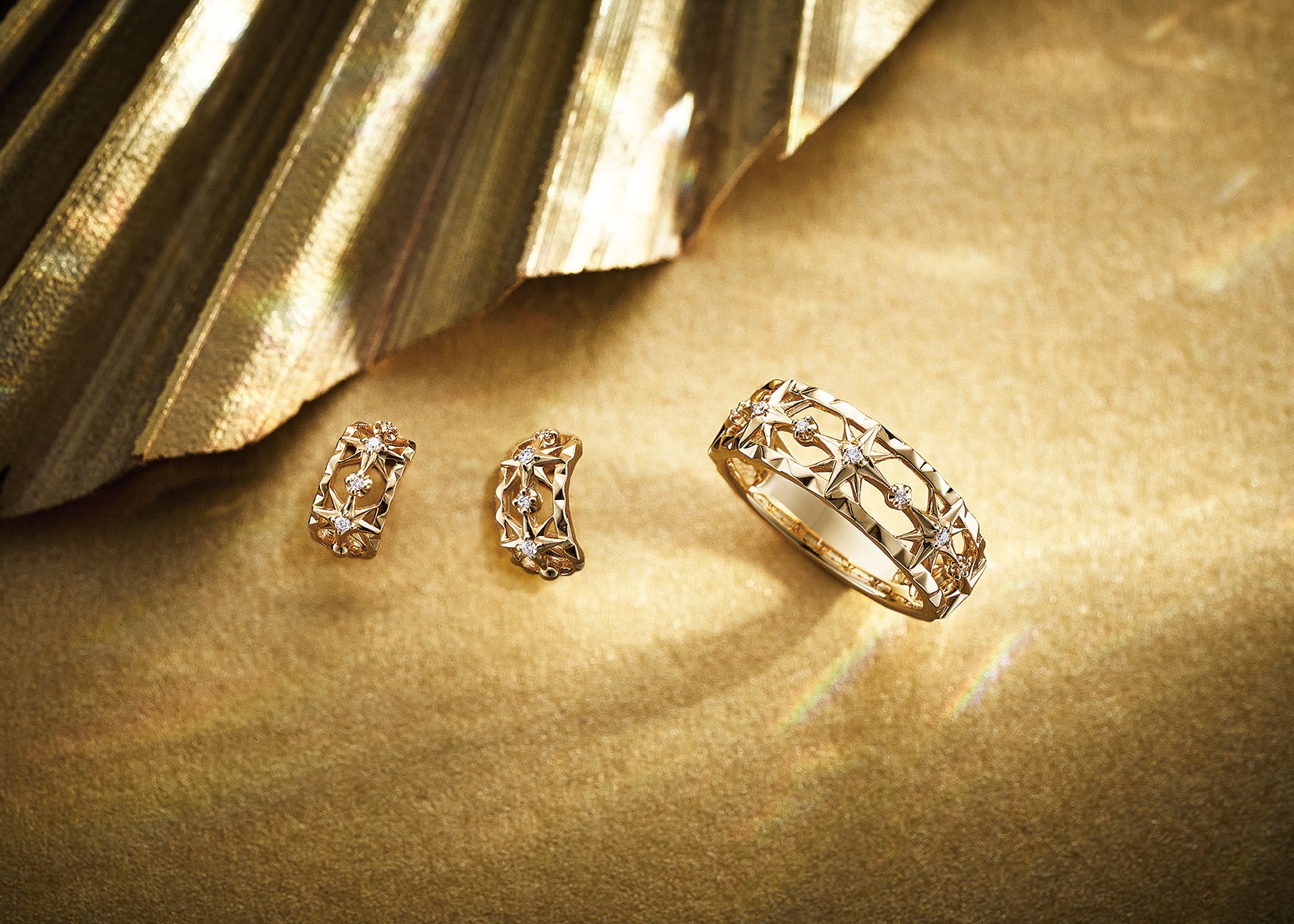 複雑な陰影を生み出すカッティングで表現された星モチーフ。熟練の職人によるテクニックが光るデザイン。リング[K18YG×ダイヤモンド] ピアス[K18YG×ダイヤモンド]