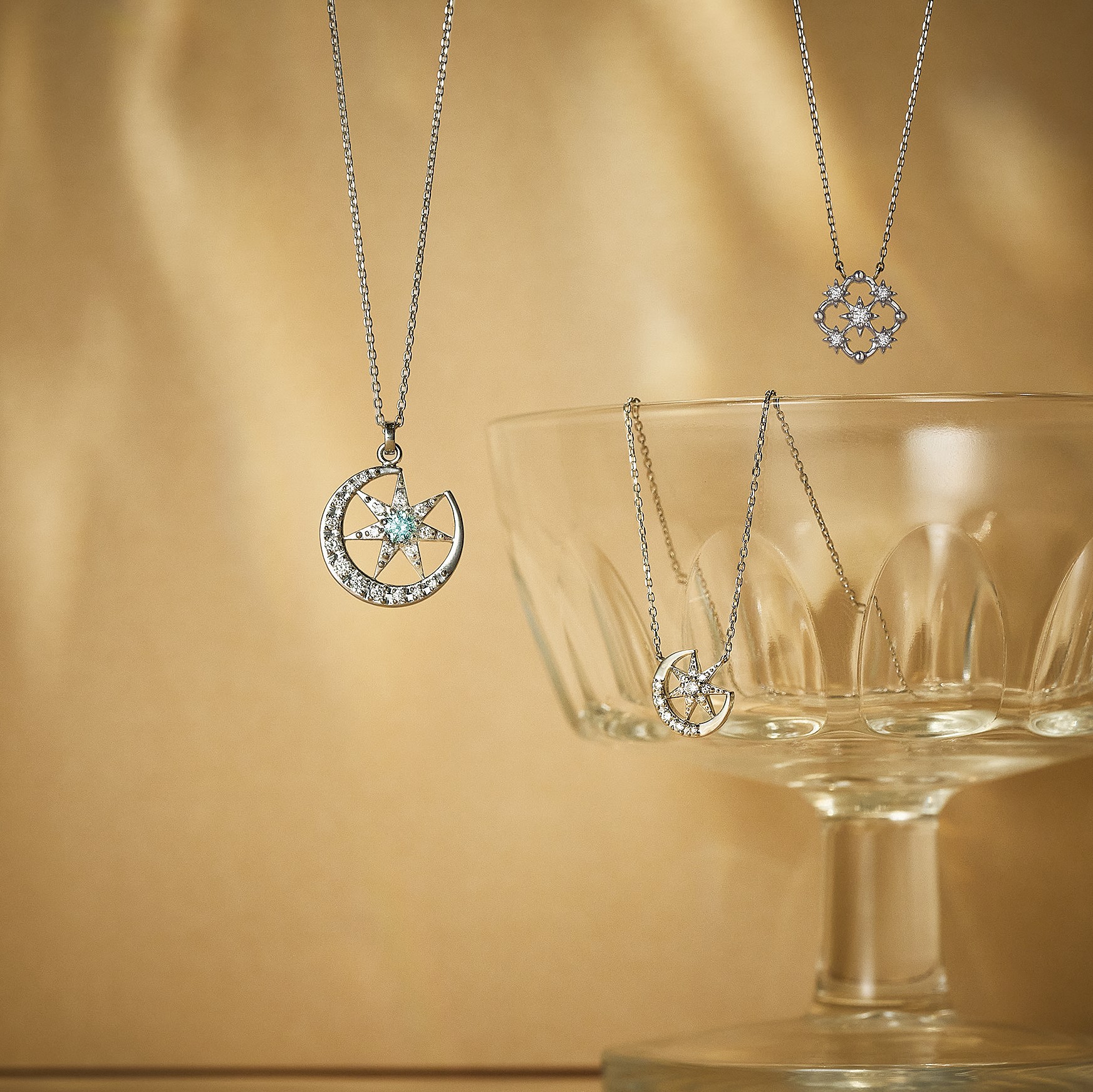 夜空に煌くロマンティックな月や星をモチーフに。アシンメトリーなデザインはシックに、シンメトリーなら可愛らしさを感じさせます。ネックレス〈右から〉[Pt ×ダイヤモンド] ★(2026年1 月29日までの期間限定販売)[Pt×ダイヤモンド] [ Pt×ダイヤモンド×アイスブルーダイヤモンド]