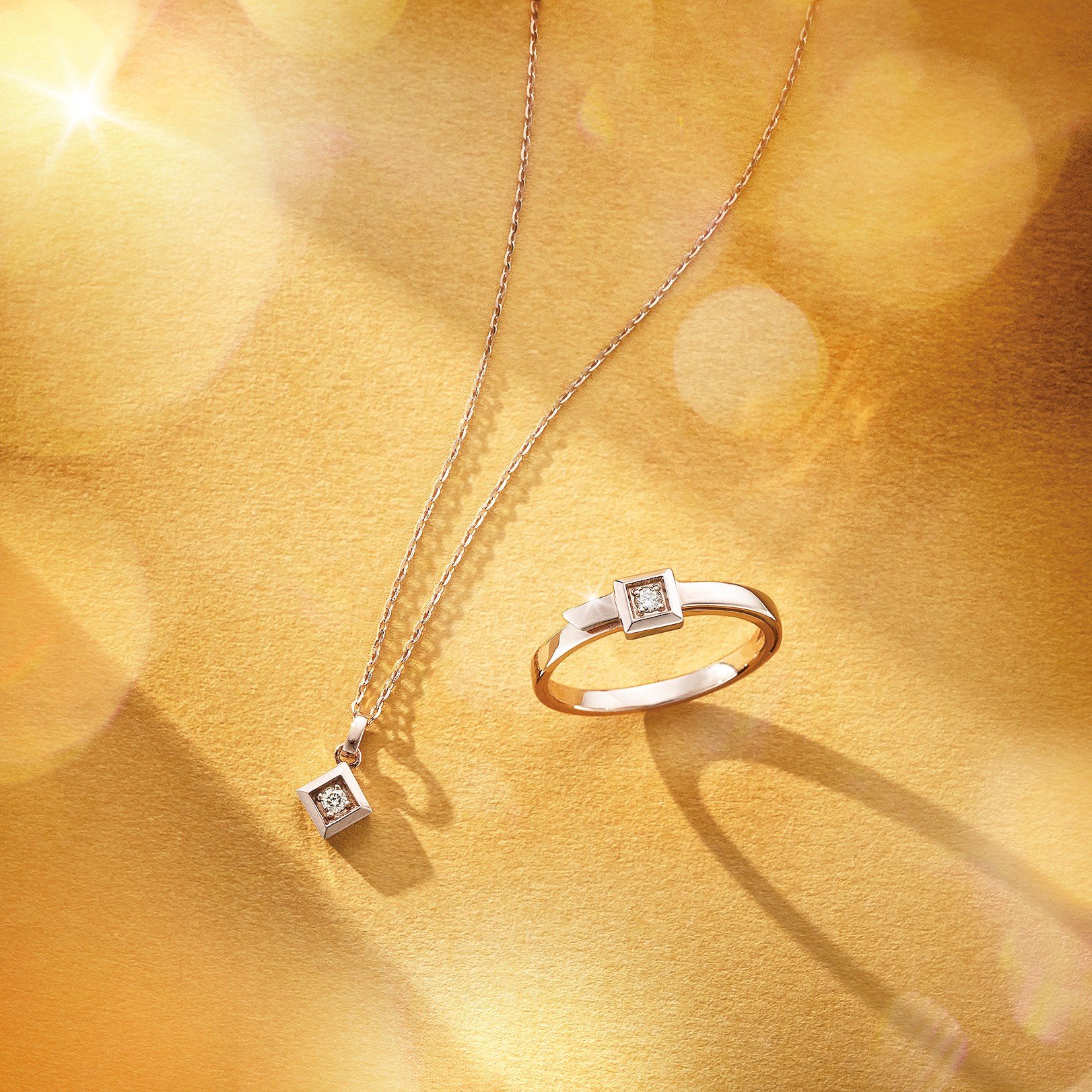 スクエアなトップに控えめな輝きのブラウンダイヤモンドを添えて。リングはベルトを巻いたようなディテールに遊び心が感じられます。リング[K10PG×ブラウンダイヤモンド] ネックレス[K10PG×ブラウンダイヤモンド]