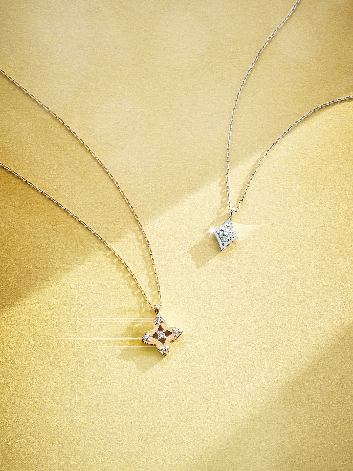 右は輝く光を、左は花をかたどって。小さなモチーフに煌めきを凝縮。ネックレス〈右から〉[K10WG×ダイヤモンド] ★[K10YG×ダイヤモンド] ★(ともに2026年1月29日までの期間限定販売)
