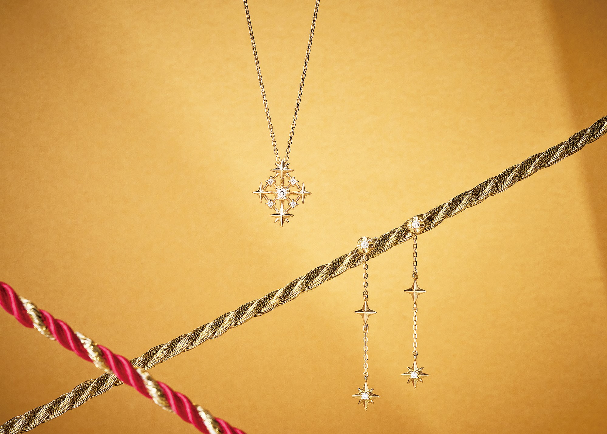 弾けるような光のプリズムをスターモチーフで表現。右は下がるパーツを取り外しスタッズピアスとしても使用可能。2wayピアス[K18YG×ダイヤモンド] ★ ネックレス[K18YG×ダイヤモンド] ★(ともに2026 年1 月29 日までの期間限定販売)