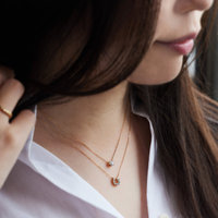 ダイヤモンドの一粒ネックレスと馬蹄モチーフネックレスをレイヤード。