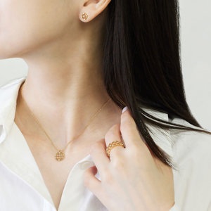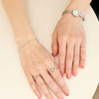 スタイリングの主役になるバラモチーフのリングに、繊細なきらめきのダイヤモンドリングとブレスレットをコーディネート。