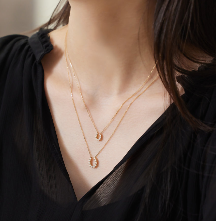 胸元に幸福を呼び込む、ホースシューネックレスのレイヤードスタイル。