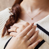 手元には透かし模様のワイドリングやエタニティリングを組み合わせることで、ボリューム感と抜け感を両立させた華やかなリズムが生まれます。