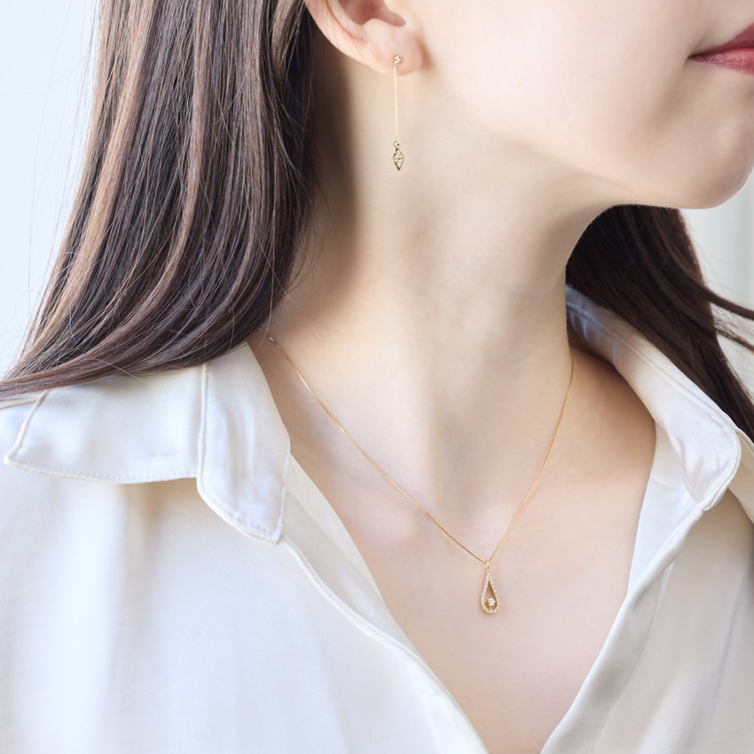雫が滴り落ちるまさにその一瞬を形にしたネックレスと、ふとした仕草でしなやかにスイングするロングピアスのスタイリング。