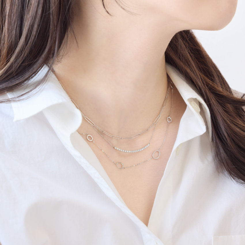 デザインの異なるプラチナネックレスを贅沢に3本重ねたスタイリング。