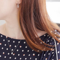 柄物のワンピースには、負けない存在感のあるドロップシルエットのネックレスがおすすめ。同じくボトムに安定感のあるリーフシルエットのピアスでアウトラインをリンクさせるとコーディネートがまとまります。ネックレスの輝きが強い分、ピアスは揺れるタイプを選んで軽やかさを持たせて。