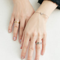 ブランドの頭文字「V」を直線的なシルエットで描いたグラフィカルなデザインのブレスレットとモダンな印象のリングをコーディネート。