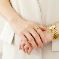 存在感のあるモダンなリングと腕時計は、あえてレイヤードせず個性を演出。