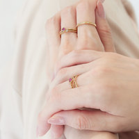 夏の日差しに似合うイエローゴールドとルビー、一際輝くダイヤモンドのコンビネーションが美しいリングのレイヤード。手元を眺めるだけで気分が上がるジュエリーコーディネートです。
