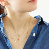 デニムシャツに揺れるピアスとカラーストーンネックレスの重ね着けでカジュアルなスタイルに。