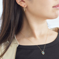ロンドンブルートパーズの艶めきが美しいネックレスと存在感のあるゴールドピアス、イヤーカフをコーディネート。