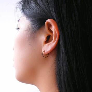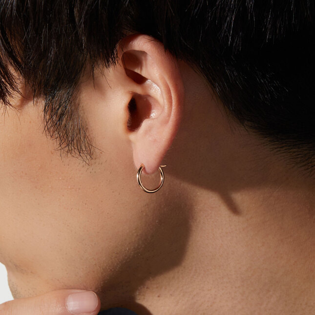 耳たぶの下に少し空間ができる程よいコンパクトさに、一本の細すぎない地金の線が凛とした存在感を放ちます。