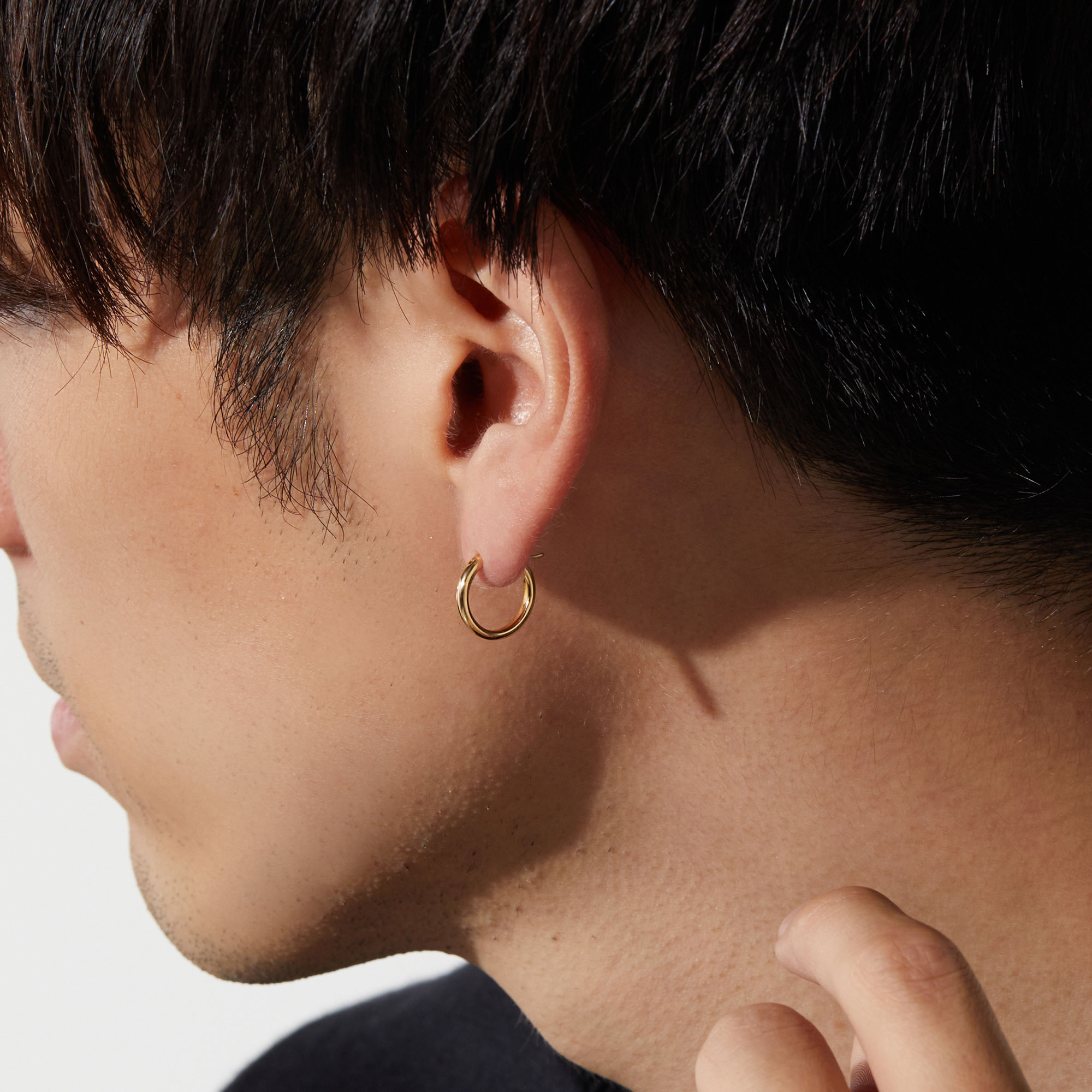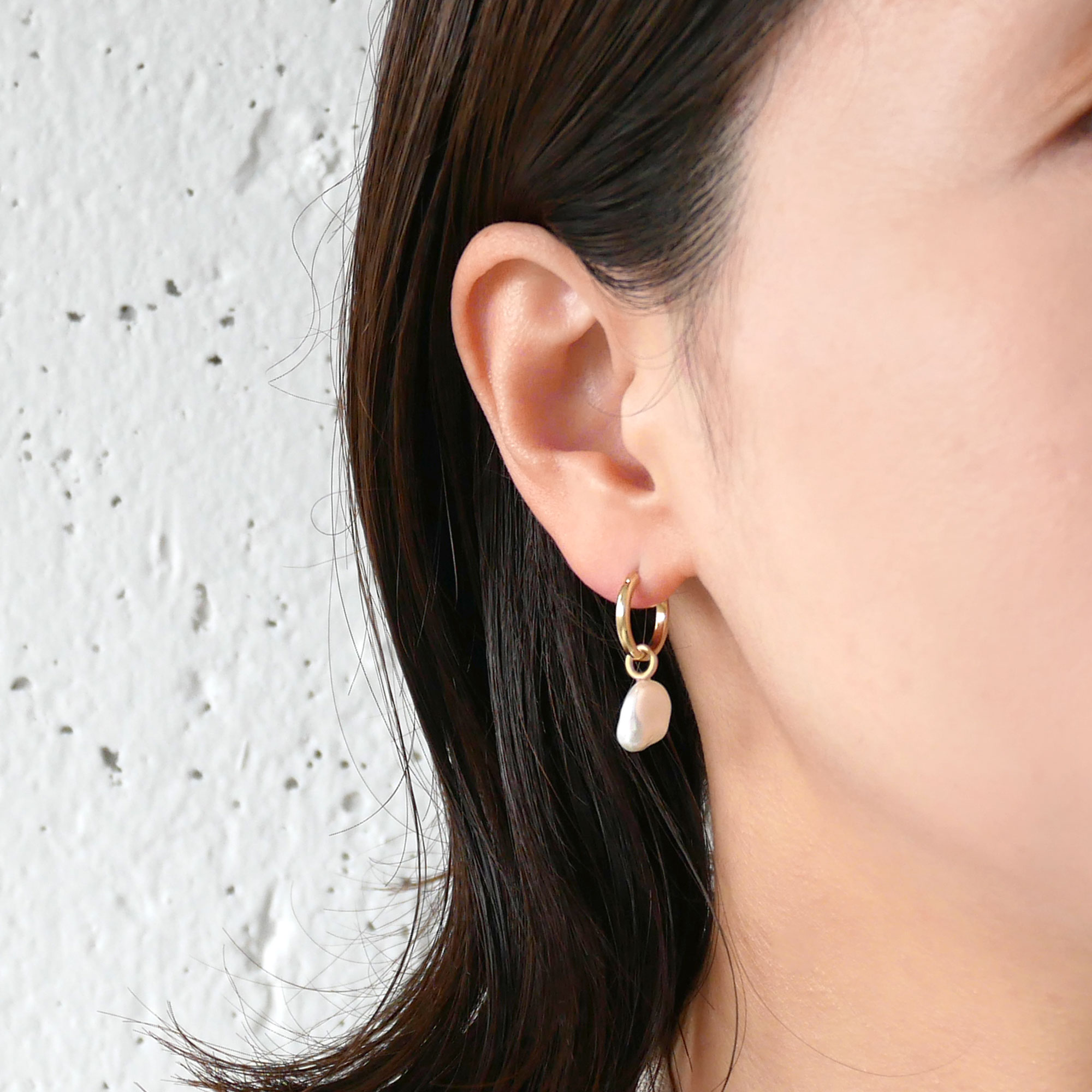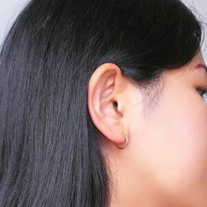 耳たぶの下に少し空間ができる程よいコンパクトさに、一本の細すぎない地金の線が凛とした存在感を放ちます。