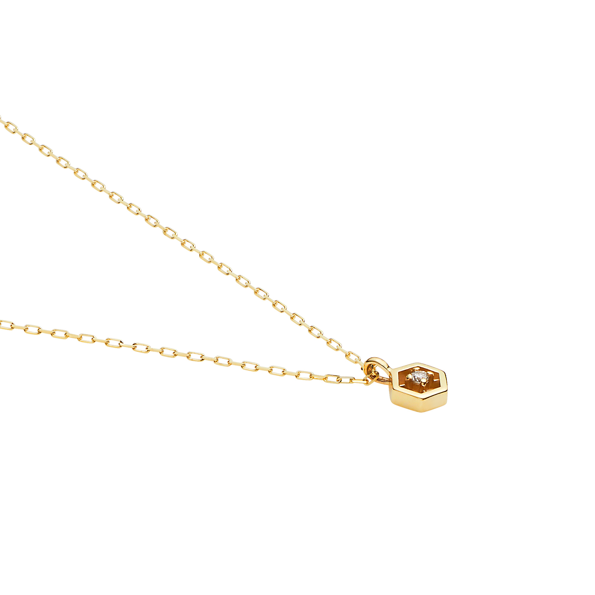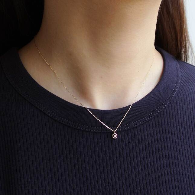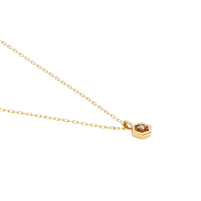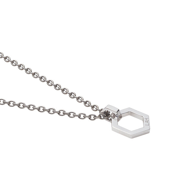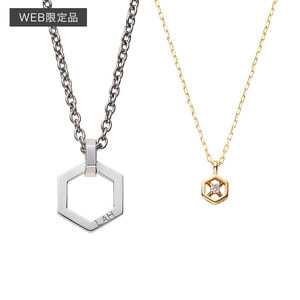ぎゅっと右回しにして絆を強める、という意味をこめた“Clockwise”は六角ナットをモチーフにしたトップが魅力的なペアネックレス。