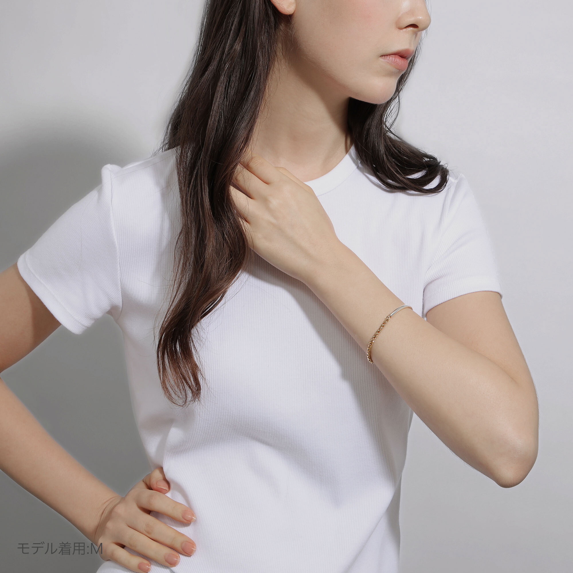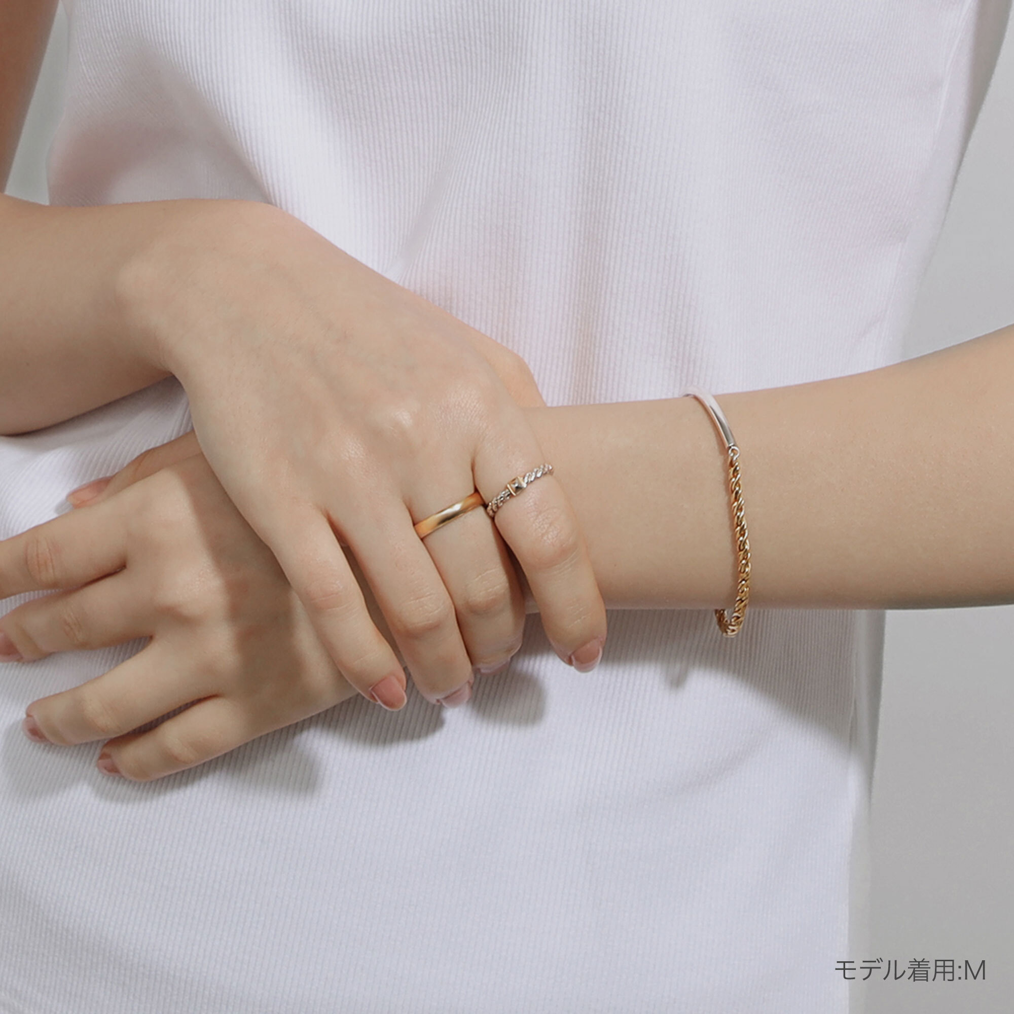 時計や他のブレスレットとの重ね着けがしやすい、程よいボリューム感もポイント。