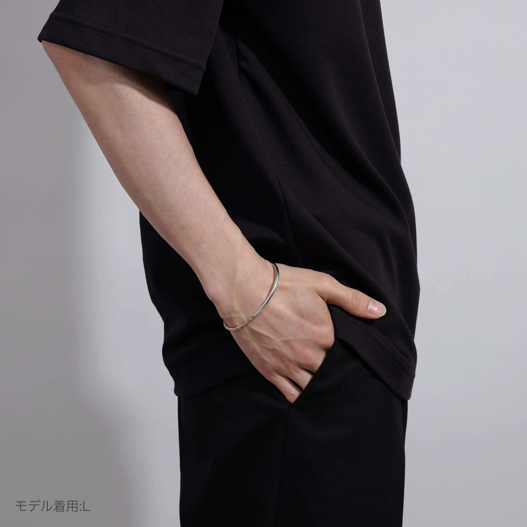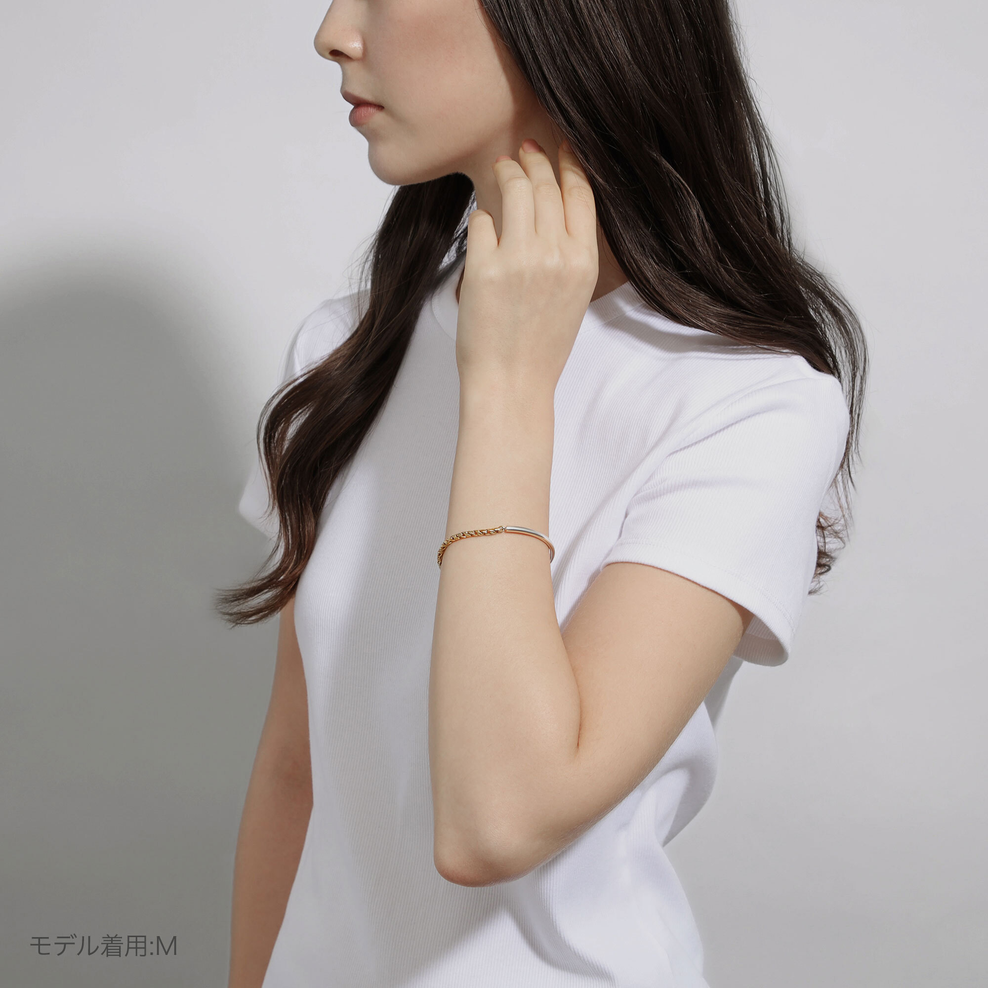 チェーンにのみイエローゴールドメッキを施しコンビカラーに仕上げる事で、より印象的な手元へと演出。