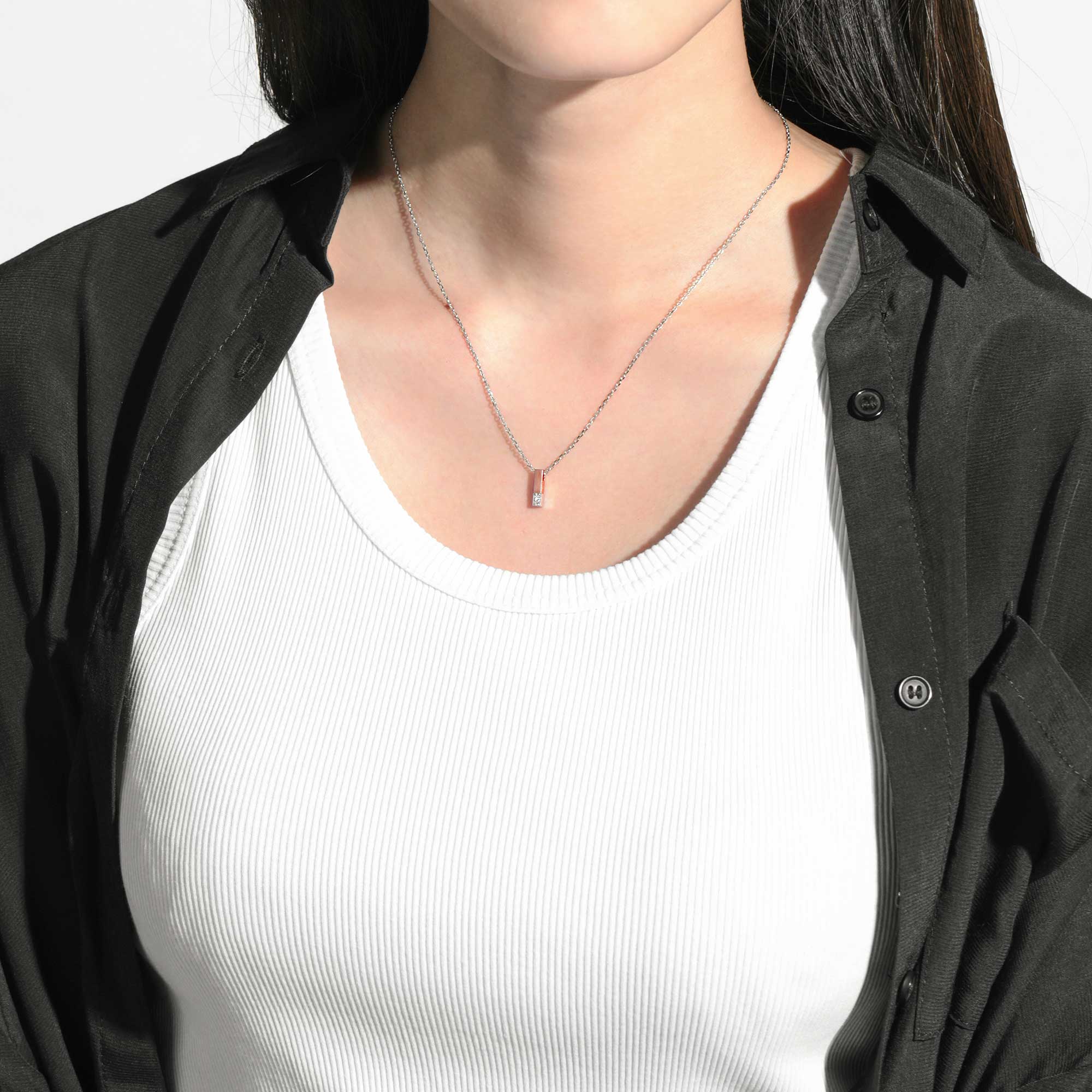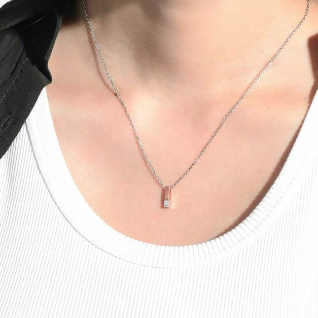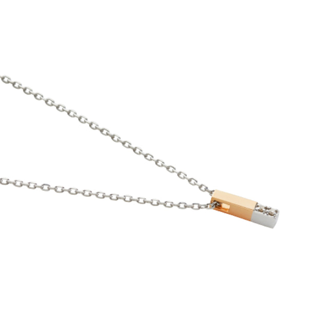ダイヤモンド入りのバー型のトップがスタイリッシュな印象のネックレス。